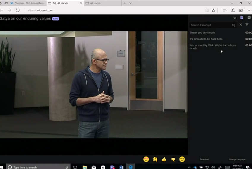 カメラでみてる画像に3Dオブジェクトを表示させて一緒にとったり。Surface Hub使ったり。Raanah氏からはTeamsのデモやInformation Protectionで自動的にIRMで保護される様子やStreamで字幕翻訳や感情分析などなど。