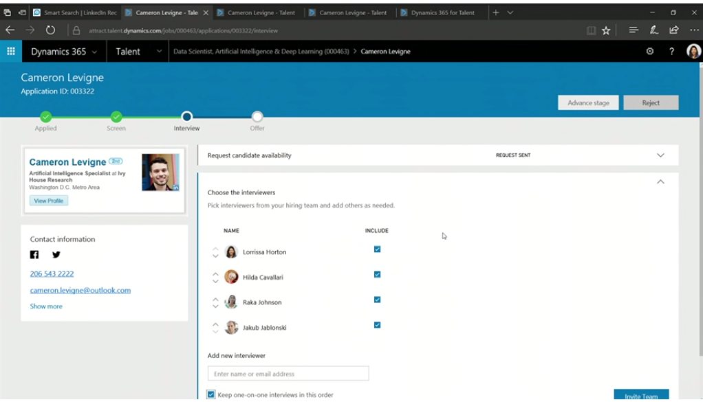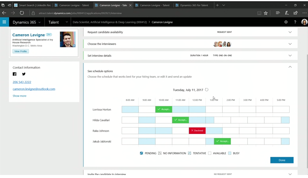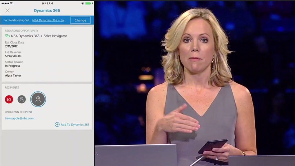 次はDynamics 365ですね。ビジネスアプリケーションはmonolithicからモジュラーでモダンなビジネスアプリケーションの集まりにとか。デモはAlysa氏。Microsoftの一員になってるLinkedInとDynamicsの連携とかかな。機械学習で機会のありそうな顧客を抽出したりして関連情報をGraph APIから引っ張ってきたり、LinkedIn上の情報をひっぱってきたりコンタクトとったり。