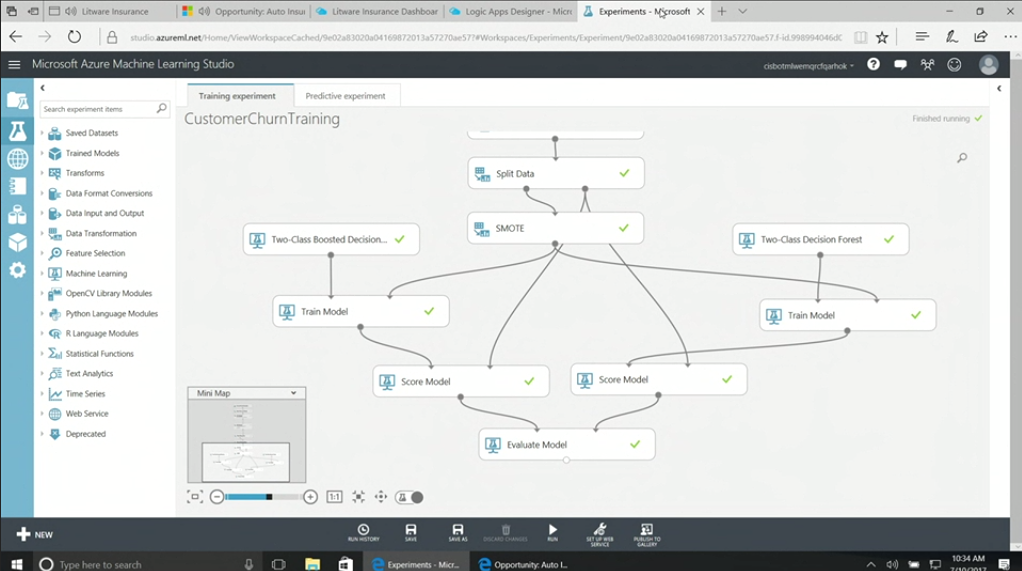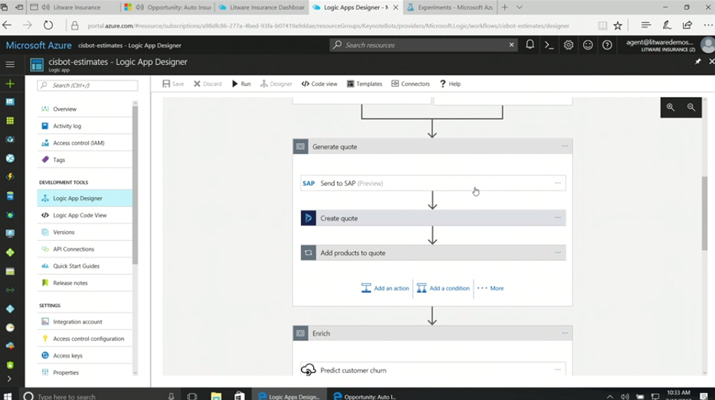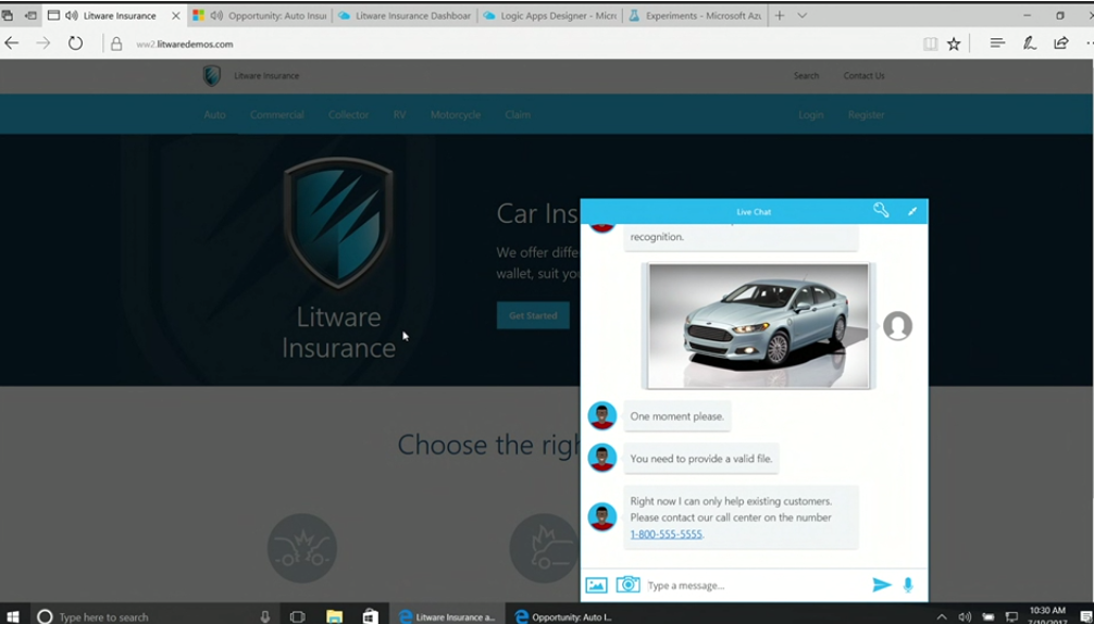 次はDataとかAI部分ですね。アプリケーションとインフラ(データとかを保管したりAIを動かしたりする部分)。Azure Stackもナウレディということでオーダー開始なようです。デモはJulia氏から。//buildでもやってた車の保険のやつですね。Webページに仕込んだWebChatからBotと対話して設問に答えてプランの相談したりするやつですね。あとはそれらを動かすAzureと、Logic Appsによるワークフローで中でCognitive Servicesよんだり。Azure Machine Learningもつかってたりします。