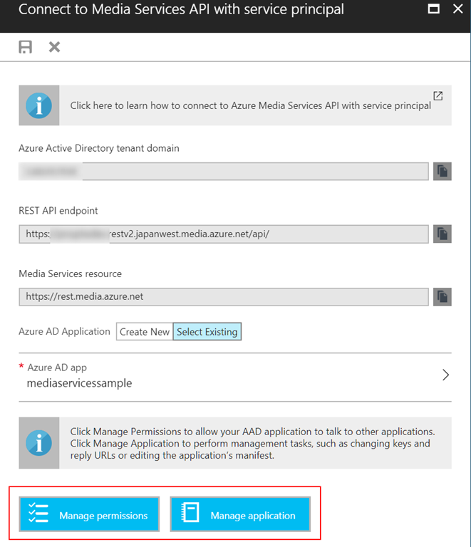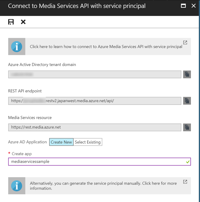 さてコードの変更点が分かったところで、サービスプリンシパルを用意する必要があります。先ほどと同じようにMedia ServicesのAPI Accessから今度は「Connect to Azure Media Services API with service principal」を選択します。![]()