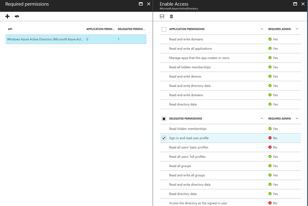権限みるととりあえずAzure ADにサインインできてユーザープロファイルが参照できればいいだけのようですね。既存のものを使う場合は参考にしましょう。![]()