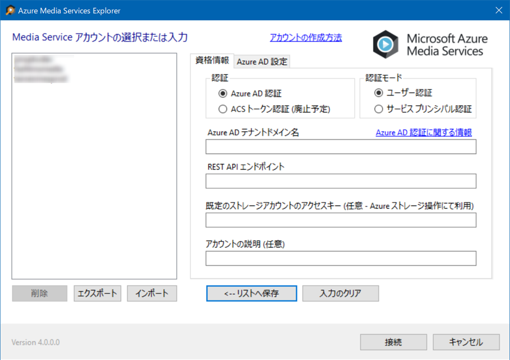 また最新版のAzure Media Services ExplorerであればすでにAzure AD認証に対応しています。![]()