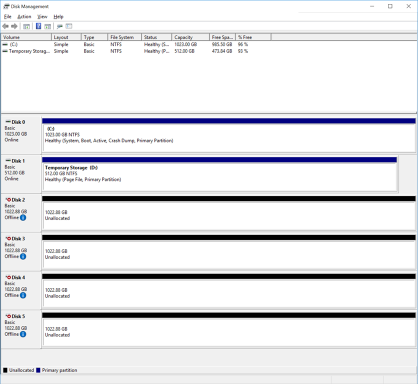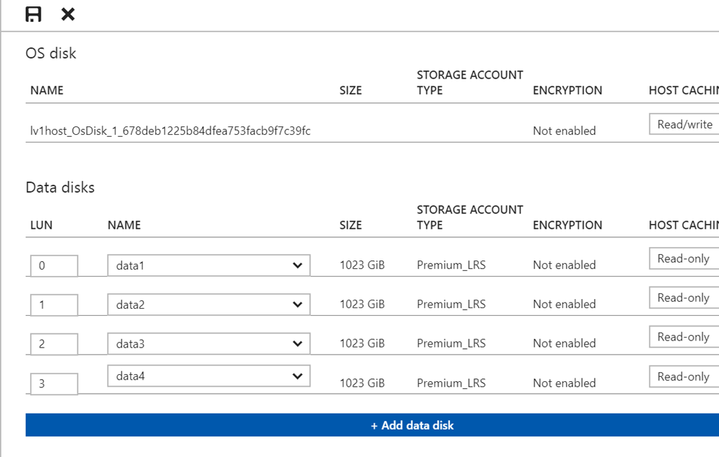 Azure VMをポータルから停止してから、Azure Stack用に物理扱いのディスクが4本必要なのでAzureのデータディスクを4本作成後、Azure VM上のHyper-Vの仮想マシンに設定する際にパススルーディスクにすることにします。(別にでかいデータディスク追加してAzure VM上でVHDXにしてもいいけど ※パフォーマンス考えてもしょうがないけどデータディスク沢山束ねて1本のディスクにしたあとVHDXを4本作って接続するとかもありかもしれない)![]()