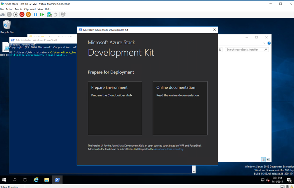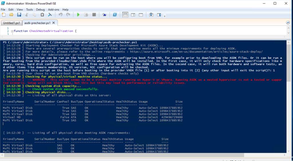 起動したら、このAzure VM上のHyper-VゲストがAzure Stackのホスト扱いの環境になります。Azure Stackが動かせられる環境かどうかチェックするスクリプトがあるので参考までに動かしてみましょう。