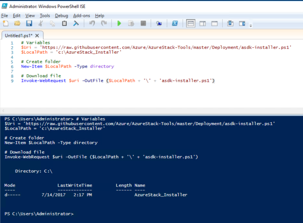 # Variables $Uri = 'https://raw.githubusercontent.com/Azure/AzureStack-Tools/master/Deployment/asdk-installer.ps1' $LocalPath = 'c:\AzureStack_Installer' # Create folder New-Item $LocalPath -Type directory # Download file Invoke-WebRequest $uri -OutFile ($LocalPath + '\' + 'asdk-installer.ps1')