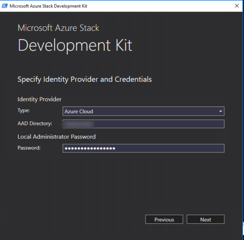 再度asdk-installer.ps1を実行してInstallを選択します。Identity Providerの指定は自分の環境にあったものにします。(今回はAzure Cloudを選択)![]()