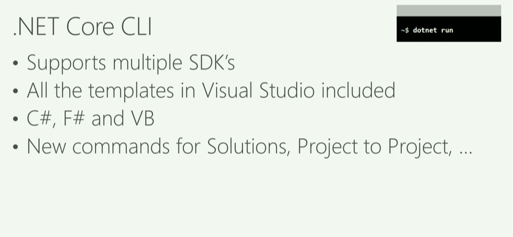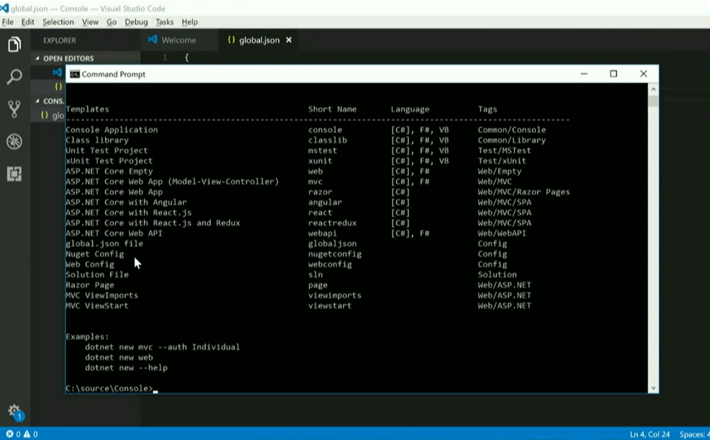 dotnetコマンドも複数SDKサポートやC#、F#、VBサポート、VS用テンプレートなどいろいろ向上してます。バージョン指定も簡単ですね。テンプレートからプロジェクト作成やソリューションにプロジェクト追加などなど。VSCodeとの連携も特に問題なく。![]()