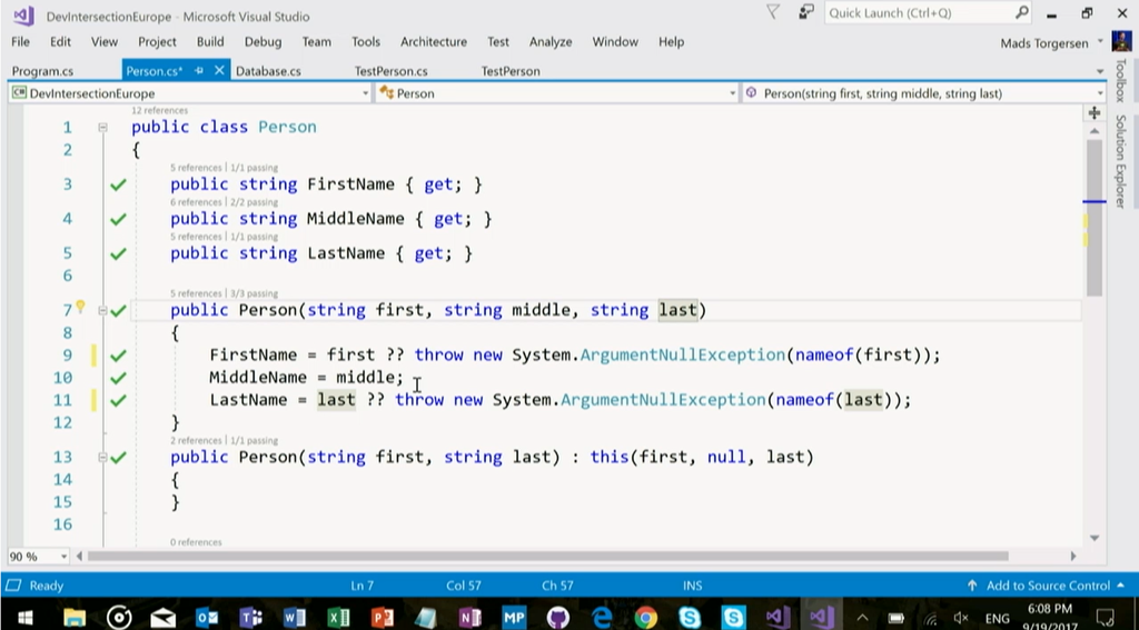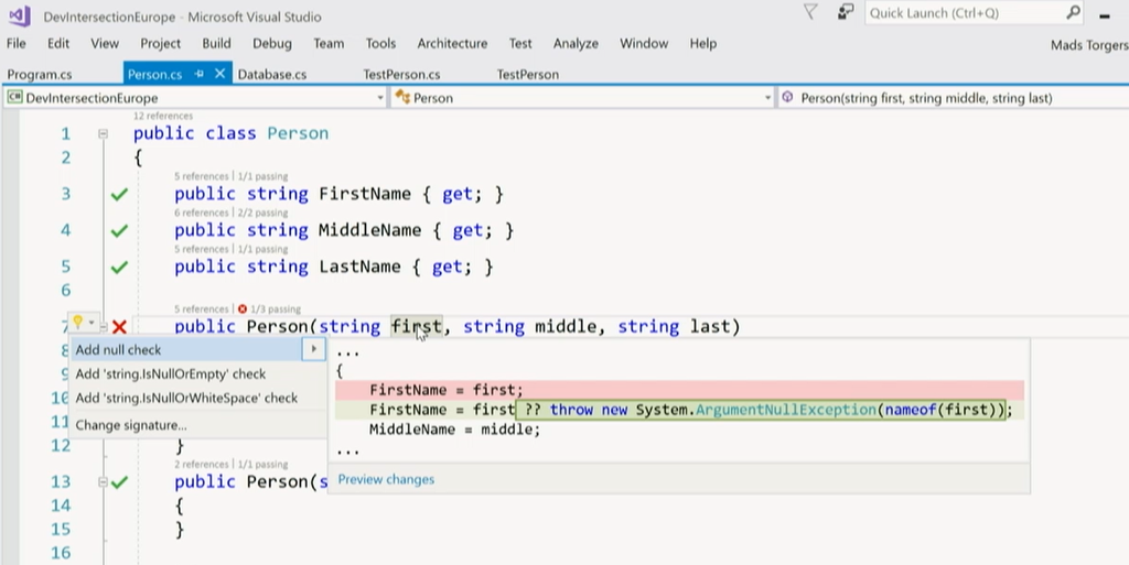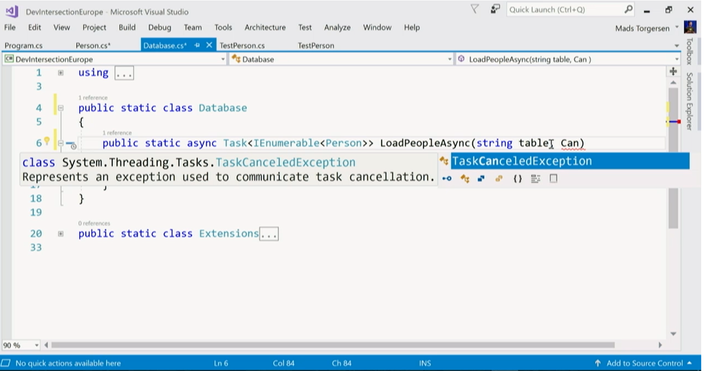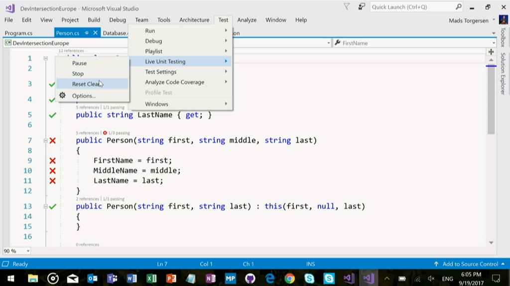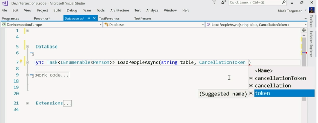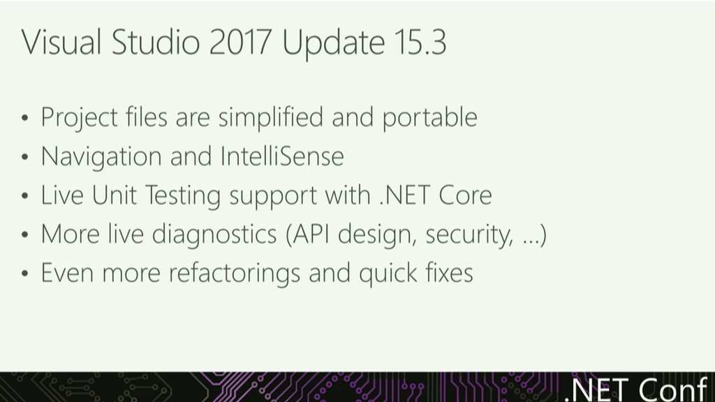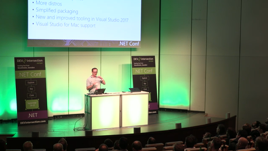 次はMads氏からVisual Studio 2017やC#の話。Visual Studio 2017 Update 3では .NET Core 2.0でのライブUnitテストなどなどいろいろ機能も増えてます。(バグフィックスも)デモではLiveユニットテストとかIntellicenseの進化(名前付けの提案とかいろいろ)とか。![]()