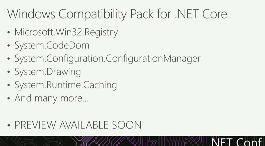 アナウンスですがWindows Capability Pack for .NET Coreというものが近々出る予定です。Win32のレジストリーサポートやConfigurationManager、Drawingなどなど。