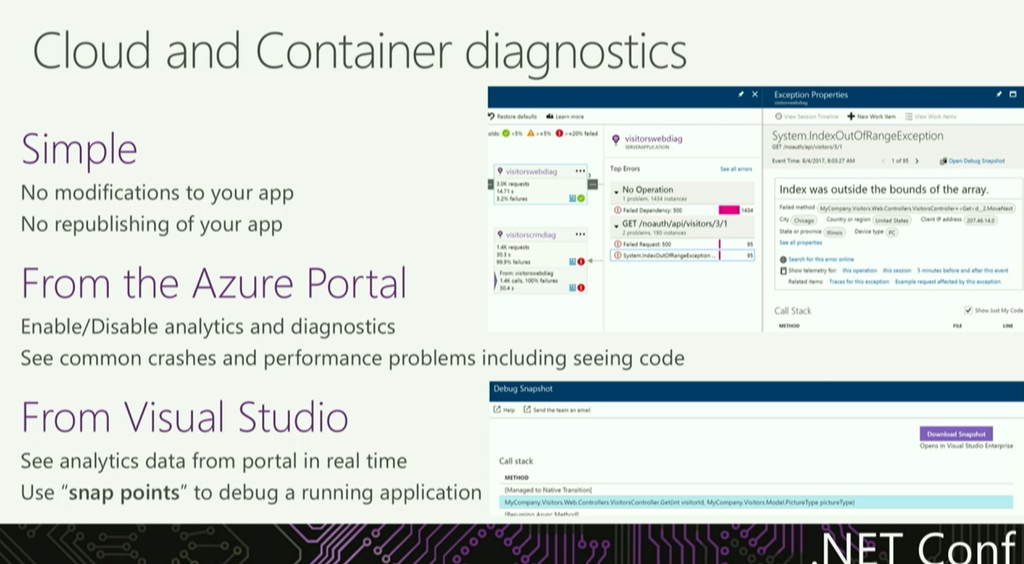 Azure連携(VS連携)もFunctions連携やコンテナー・App ServiceのCI/CDサポート、Azure Diagnostics連携など。診断周りはクラウドとContainerも含めてVSやポータルから分析できます。VSからだとスナップポイント使ったデバッグもできますね。アーキテクチャやベストプラクティスなどについてはアーキテクチャーガイドも参照ください。![]()