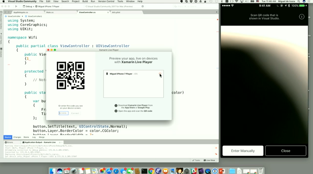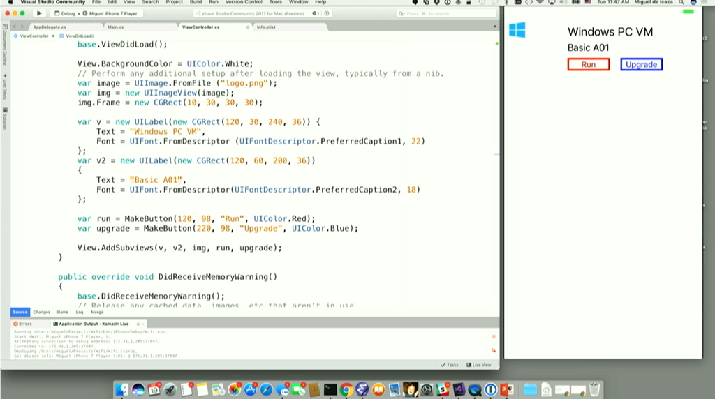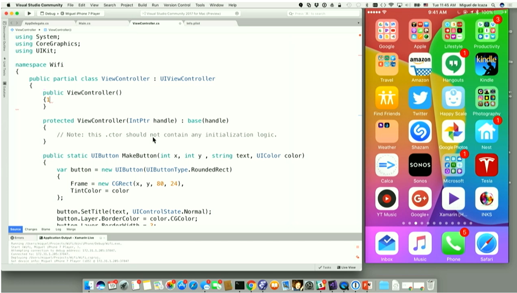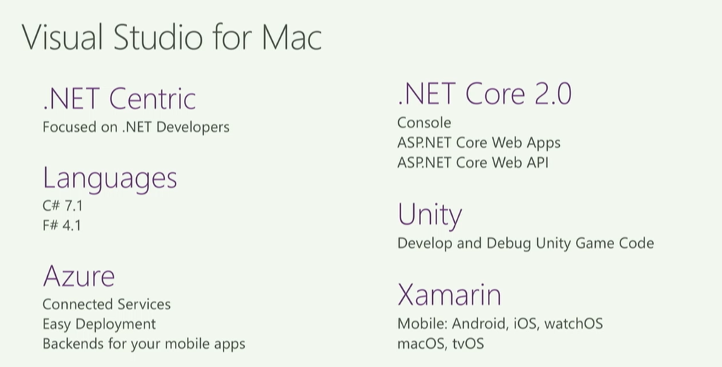 Visual Studio for Macでは.NET CentricでC#7.1/F#4.1サポート、Azureや.NET Core 2.0、UnityやXamarinをサポートします。デモではXamarin使った開発ですね。実機とペアリングしてデバッグとか(Preview)。エディット&コンティニューやリアルタイム反映もサポート。![]()