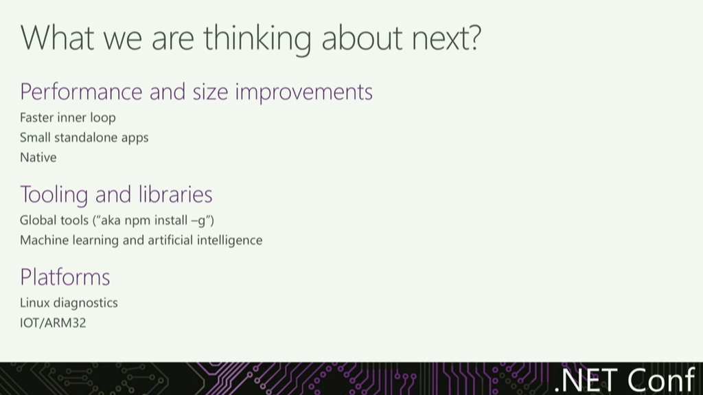 さて今後の話です。パフォーマンスやサイズの向上、グローバルなツール(npm install -gみたいな)、機械学習やAIの利用(かな)、Linuxでの診断やIoT/ARM32プラットフォームサポートなど見てるようです。C#8.0の話とかも少し出ましたね。(Async StreamとかNullable Reference TypeとかInterfaceへのdefaultパラメーターとか)