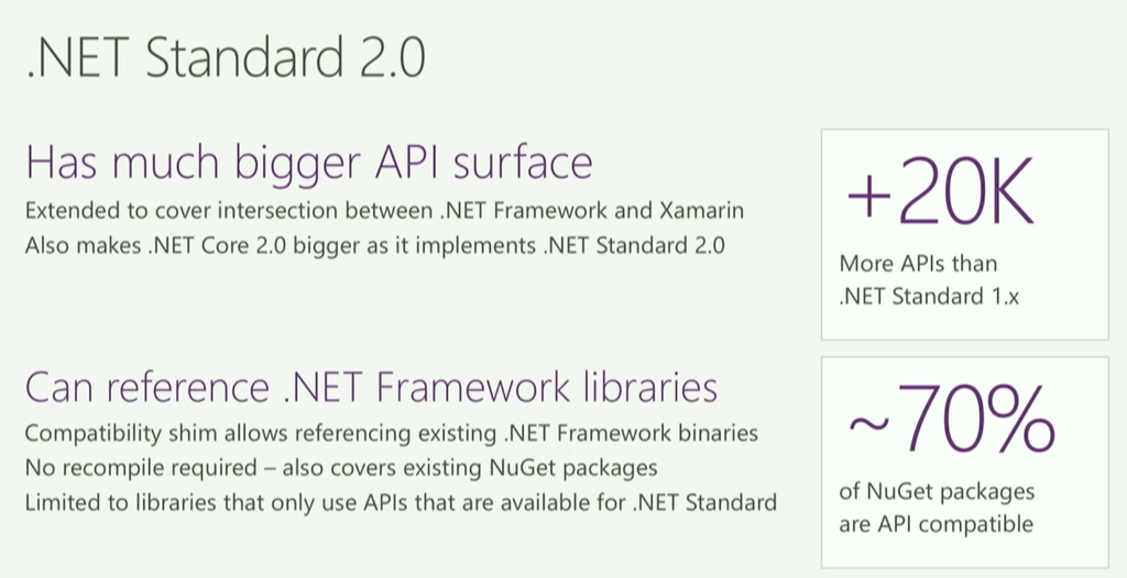 最近の.NETなPlatform状況など。.NET Standard 2.0では1.xに比べて2万以上API増やしたりNuGetパッケージも70%ほどAPI互換があったりします。後はVS2017連携で簡単にNuGetパッケージのビルドできたり。![]()
