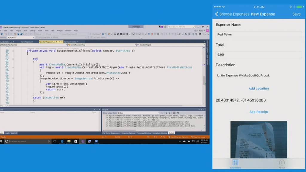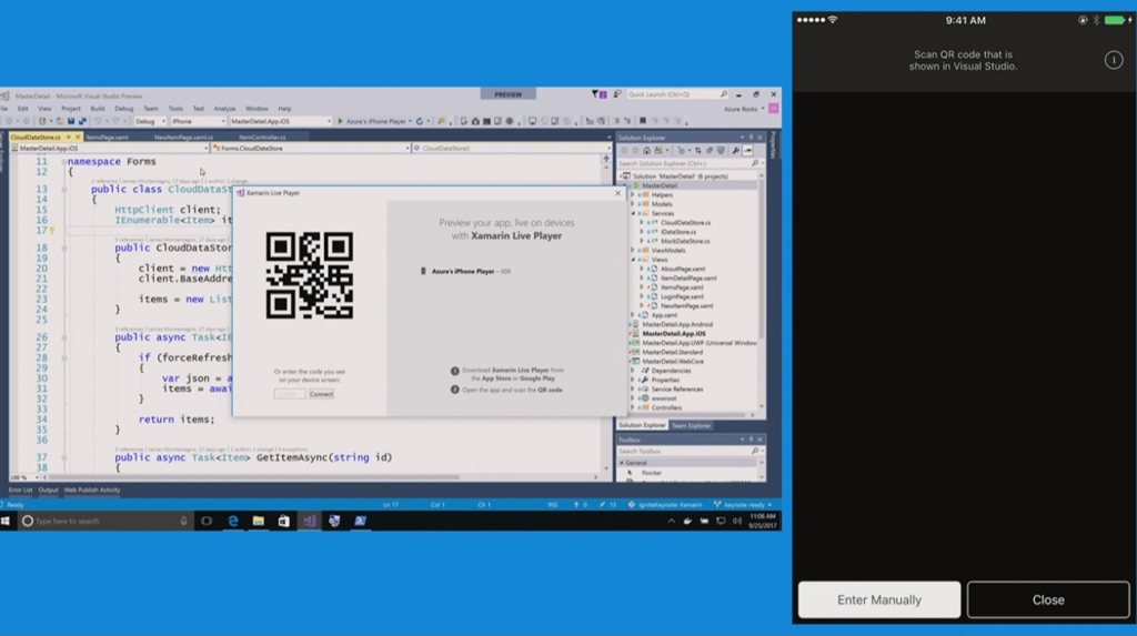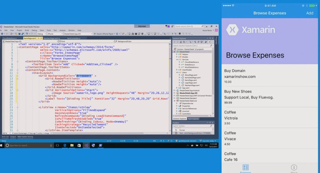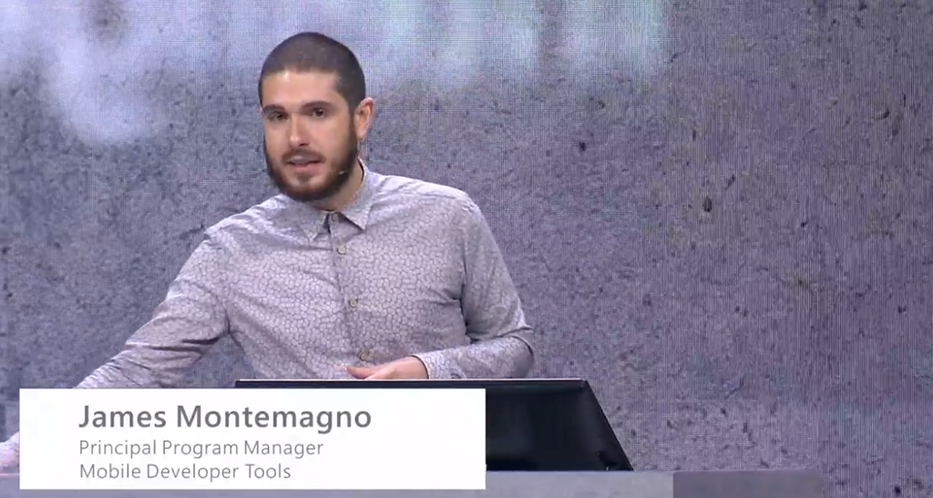 次のトピックはモバイルとクラウドの開発周り。Visual StudioとAzure、それから各フレームワークなどの話ですね。デモはJames氏によるXamarin関連から。VSで実機とWiFiで接続してデバッグとか(dotnetConfでもやってましたね)