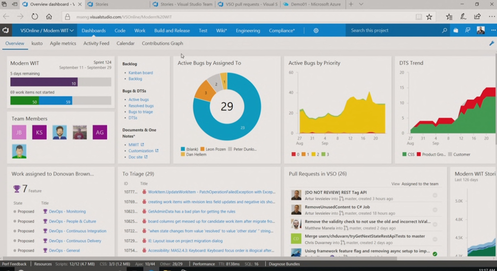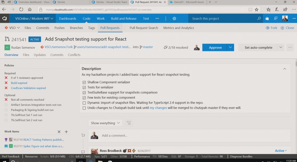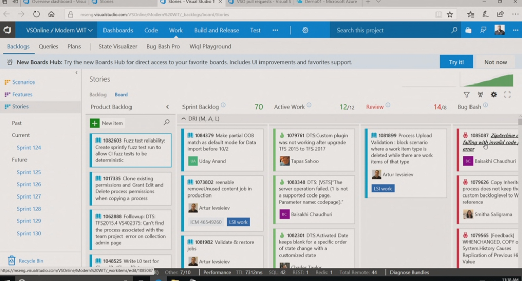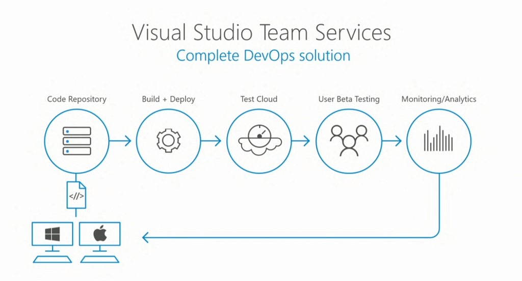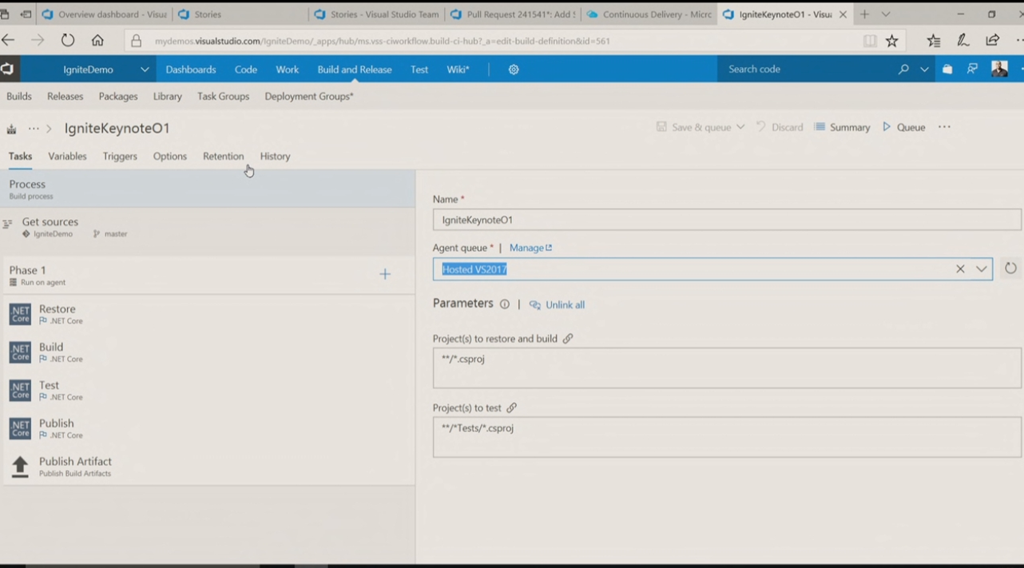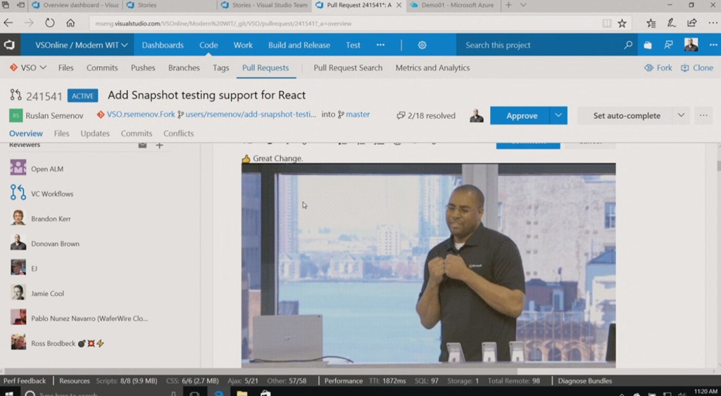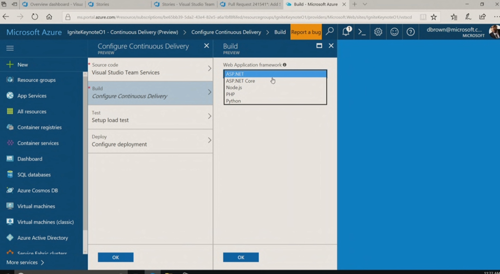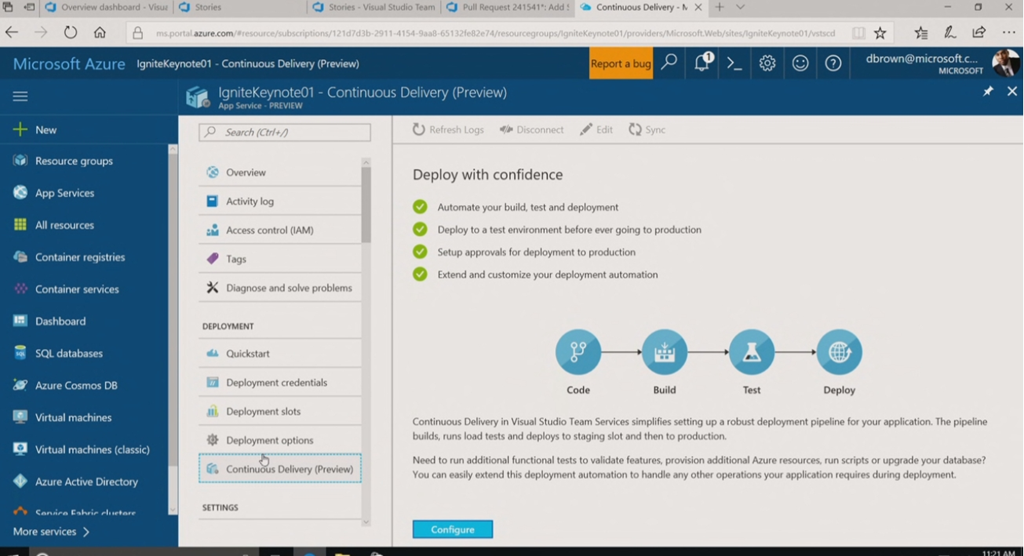 次のTopicはDevOps。Visual Studio Team Servicesですね。デモはDonovan氏から。カンバンとかGit連携とかの話。それからAzure上のWeb AppsとのCI/CD連携。Microsoftだけど .NET以外もサポートしてるよというアピールしつつ。CIなんでVSTSでビルドもできますね。![]()