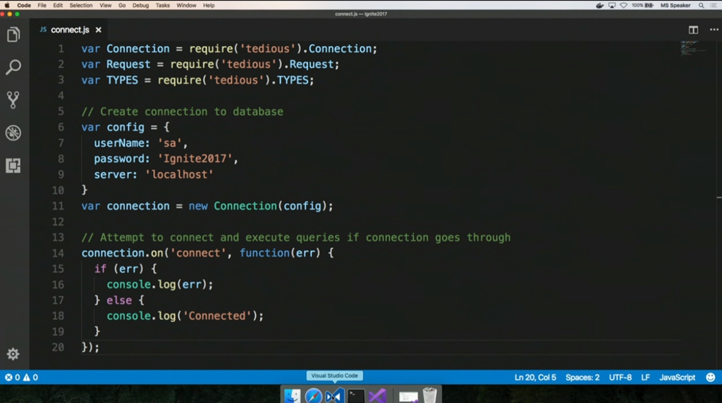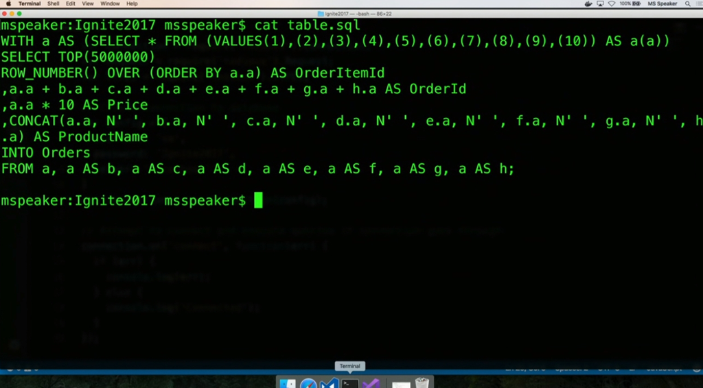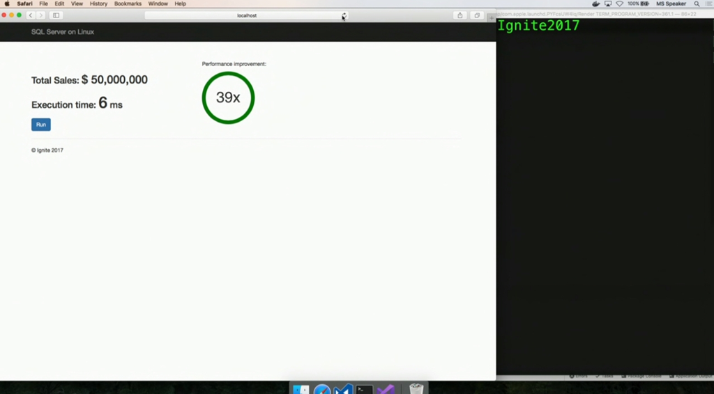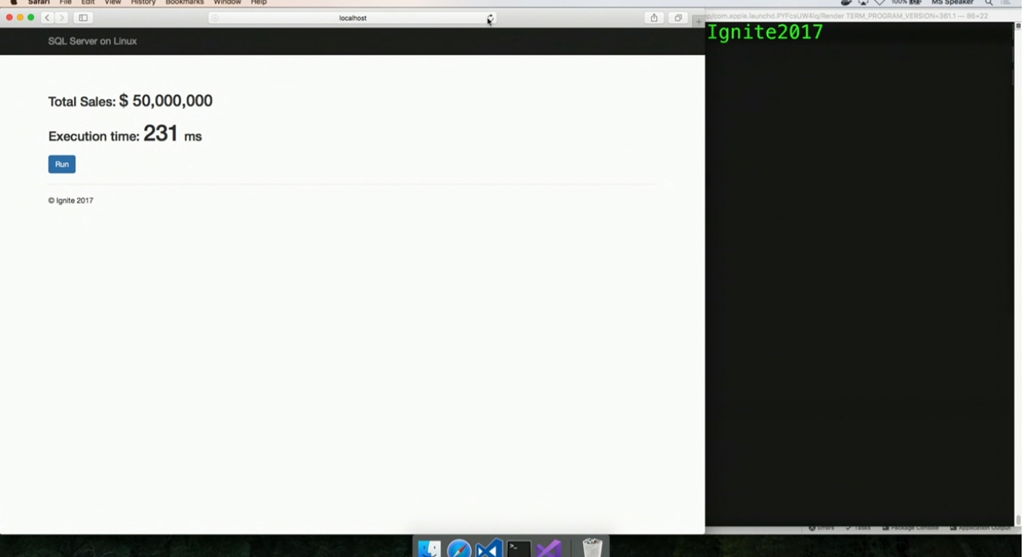 デモはLara氏から。macOS上のDockerコンテナーでSQL Server 2017を動かしてますね。TDSドライバーもあるのでnode.jsからでも問題なく繋がります。エンタープライズグレードでもOKですよとアピール。SQL Server Expressも込みみたいですね。![]()