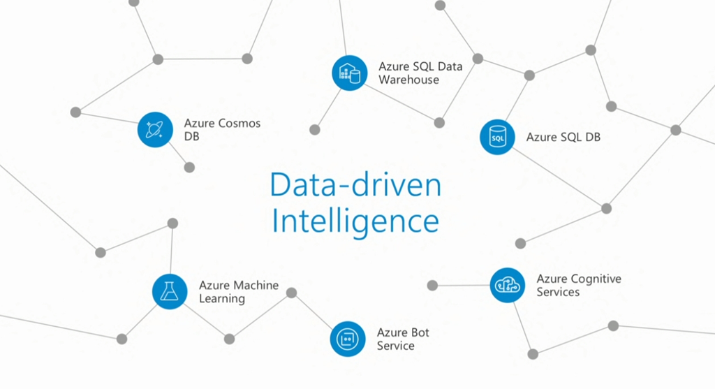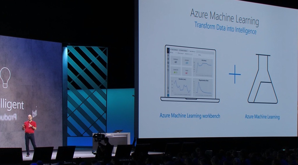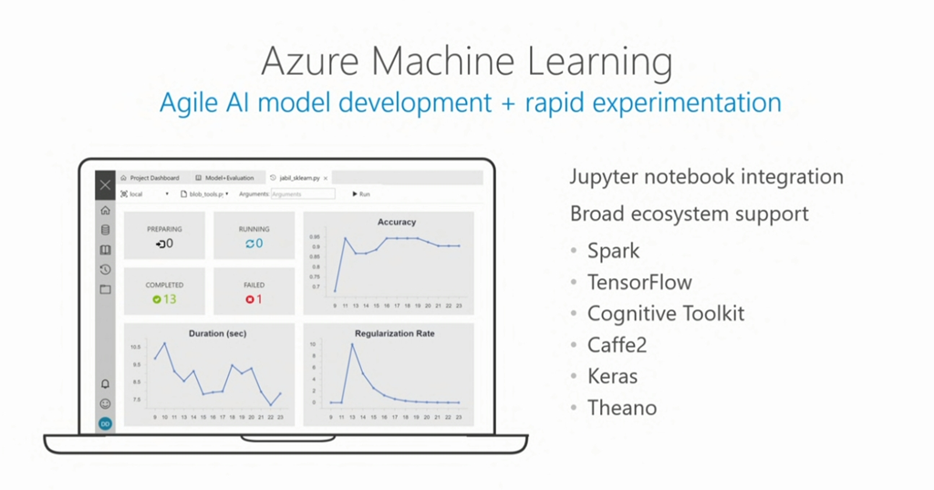 次のTopicは機械学習ということでAzure Machine Learningですね。新しくAzure Machine Learning Workbenchも加わりました。アジャイルなAIモデルの開発やラピッドな実験がすぐにできるようにJupyter notebook統合やSpark、TensorFlowなどなどのサポートなど。作ったモデルはDockerコンテナーで好きなところで実行。