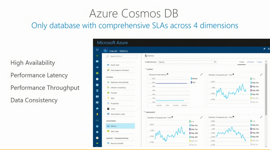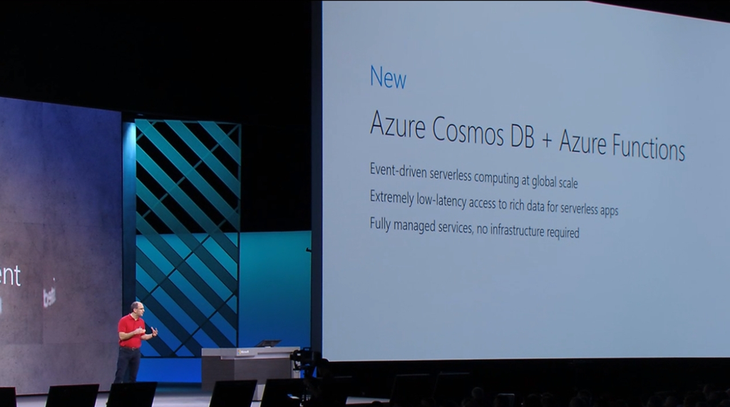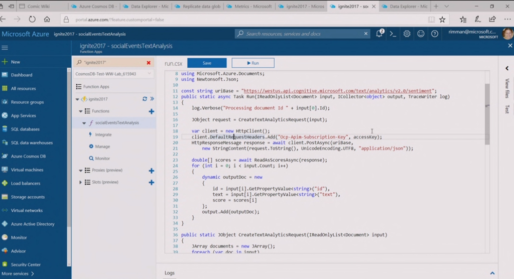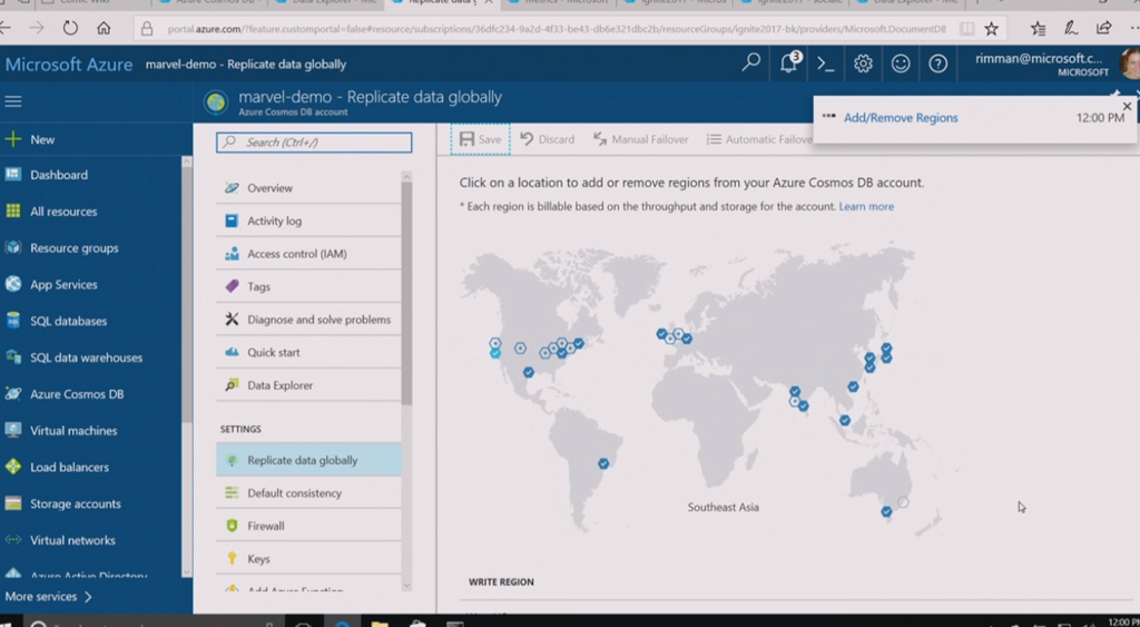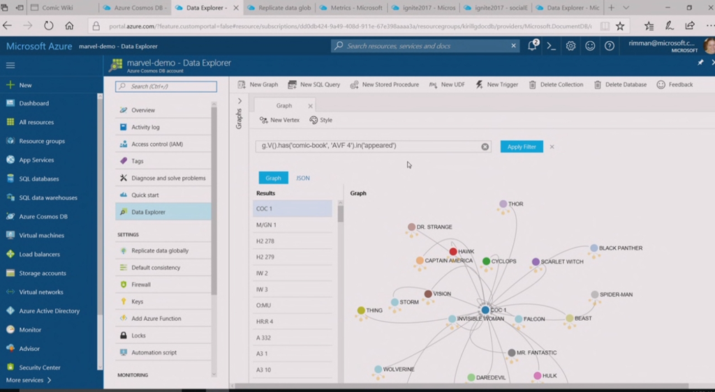 次はCosmos DBの話題ですね。新し目の話題としてはCosmos DBとFunctions連携のところでしょうか。デモはRimma氏。DBのAPIとしてGremlinとかも使えるしポータル上でGraph見たりできます。またリージョン追加して分散させたりとか。