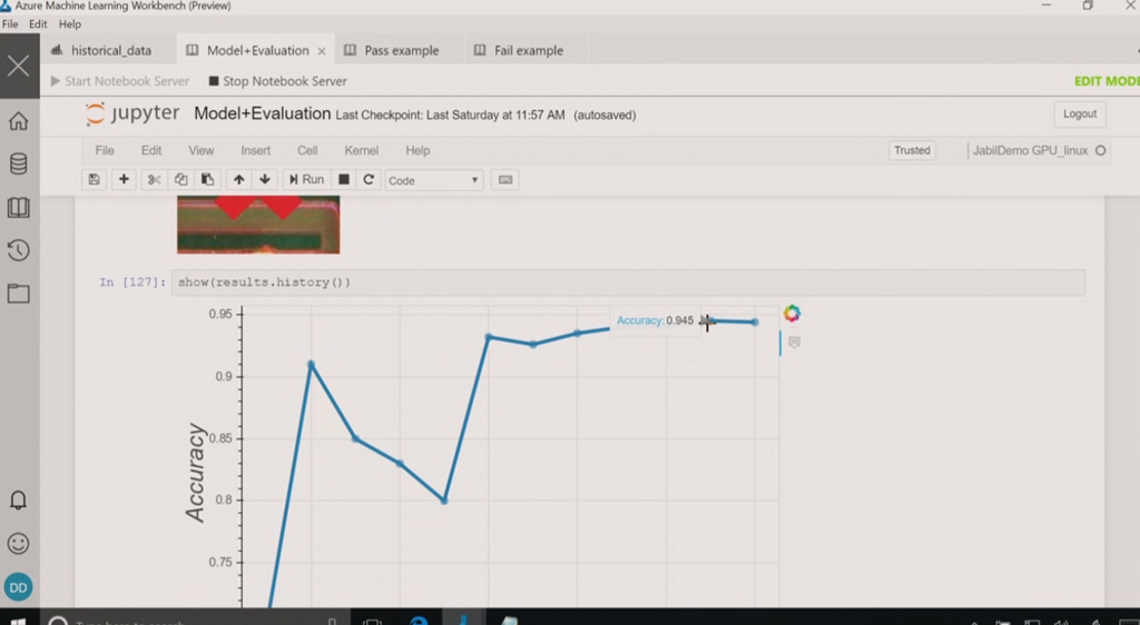 デモはDanielle氏。電子部品の検査でOK/NGの画像を学習させて判断させるというデモですね。Azure Machine Learning Workbenchで学習データ取り込んで学習させます。WorkbenchのなかでJupyter notebookな形式なので慣れ親しんだ人にはわかりやすいかもですね。デモだけで見るとCustom Vision APIぽいですけど、自分でモデル作って学習させるための環境がまとめて手に入るのがいいところかと。![]()