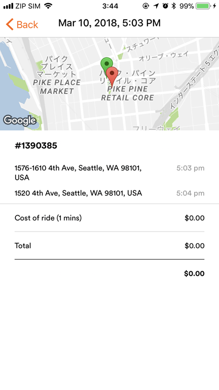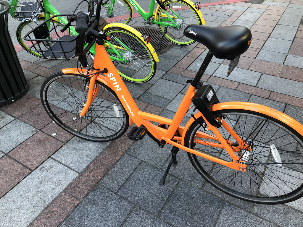 - シアトルは自転車の乗り捨ての会社が3社ぐらい(SPIN、Lime、ofo)がんばってるのでせっかくだから借りてみた。