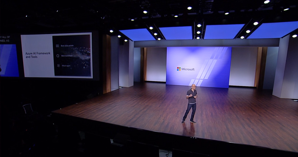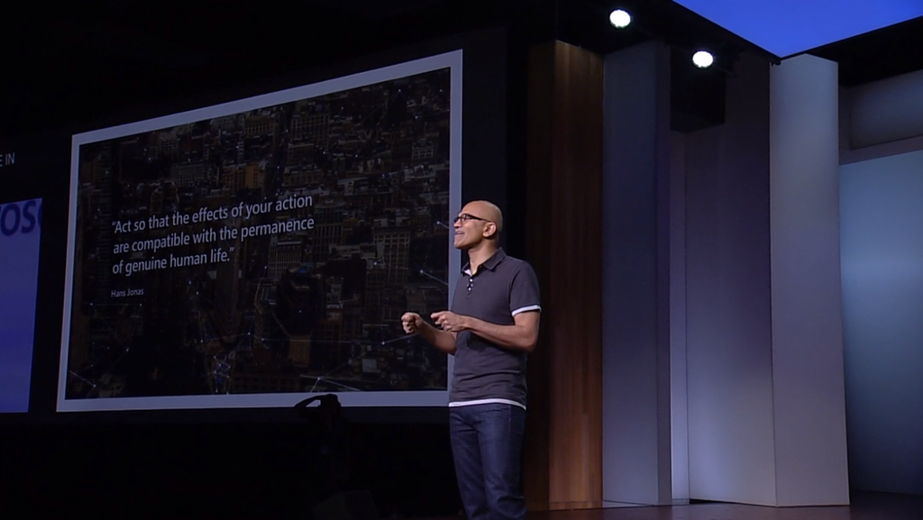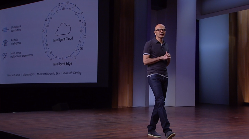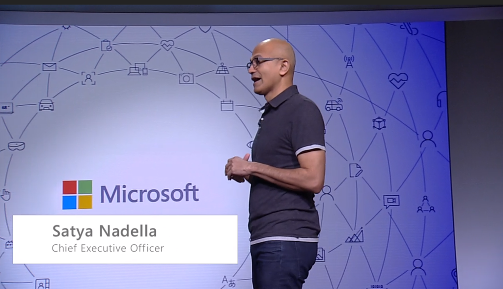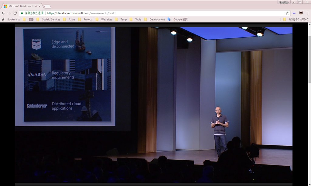 本編まちかね。最初はCEOのSatya氏から。ビルゲイツがAppleについて語るようになったとかMicrosoftは新しくなったとかでつかみはOK(?)。産業革命の話とかもおなじみですね。産業とITの関わりの変化(デジタルトランスフォーメーション)とかコンピューティングパワーとか2年後どうなるか的な話。![]()