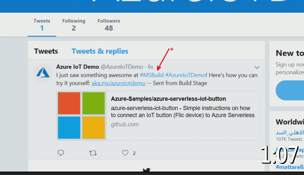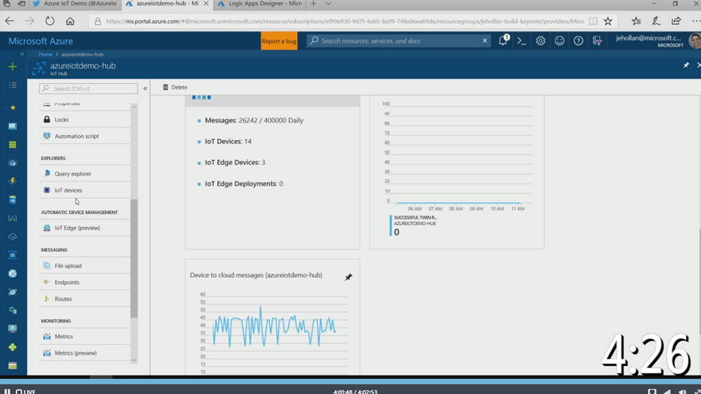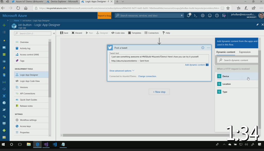 次はIoT関連ですね。デモはJeff氏。突然タイマーが表示されてライトニングトーク風に。デモはシンプルなセンサーデバイスをトリガーにしてアクション(ツイート)するというもの。ローカルデバッグまで入れてますね。イベントがきたらFunctionsからLogic AppsになげてTweet。![]()