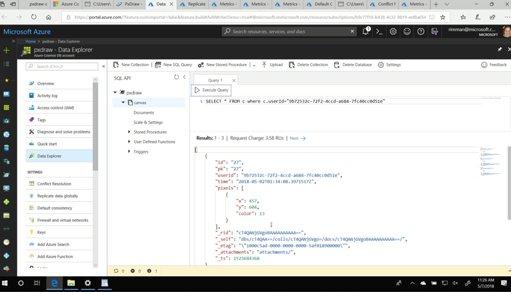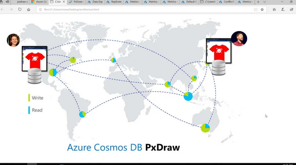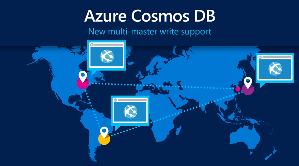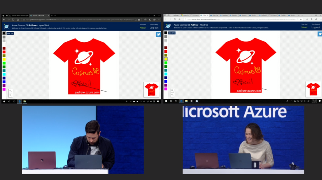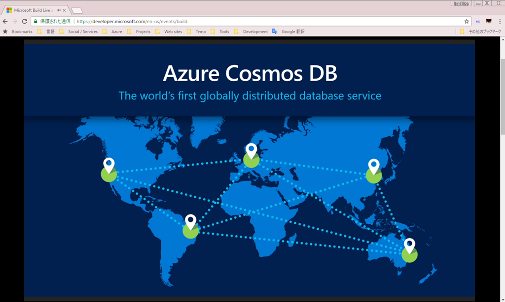 お次はData関連。データストアもいろいろ出てますね。Cosmos DBのおさらいから。最近ではCassandraもサポート。デモはRimma氏からCosmos DBのグローバルなレプリケーションについて。異なるリージョンのデータを見てる人の片方が書き込んだりしたのをニアリアルタイムで同期して表示させたりしてます。(ちゃんとDBにデータ書き込んでる)