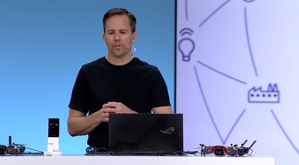 Azure IoTのデモということでSam氏が。Azure Sphereのチップとかかっこいいですね。デモはドローン上に搭載したQUALCOMMのカメラとIoT Edge上で動くモデルを使ってパイプの故障個所をリアルタイムに判別・ストリーミングで(UWPアプリで)確認するという感じ。![]()