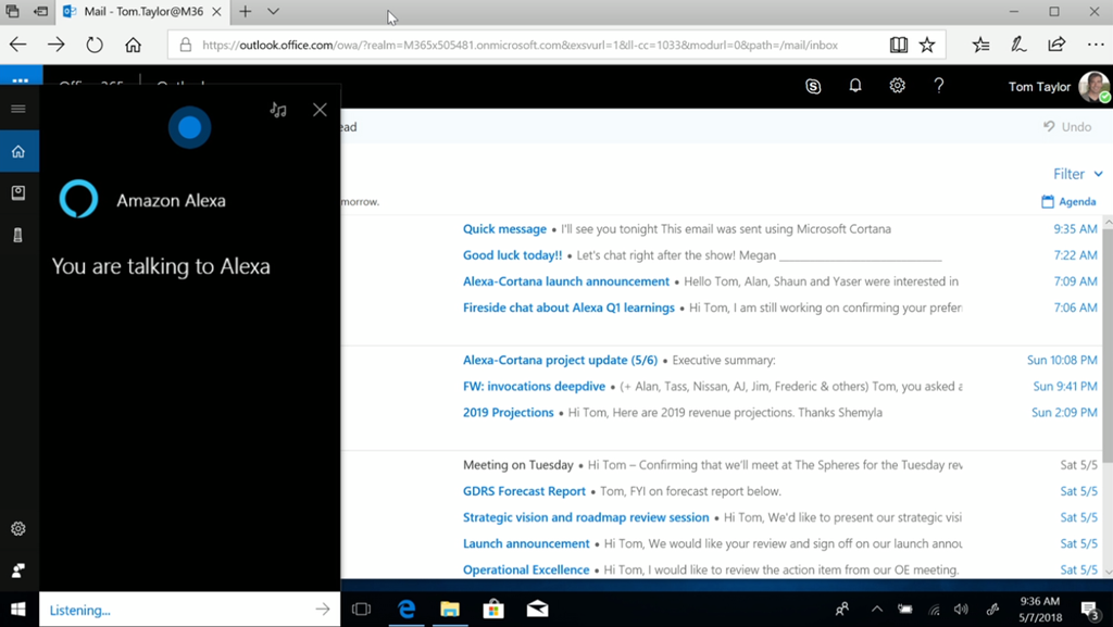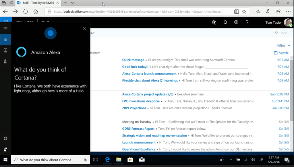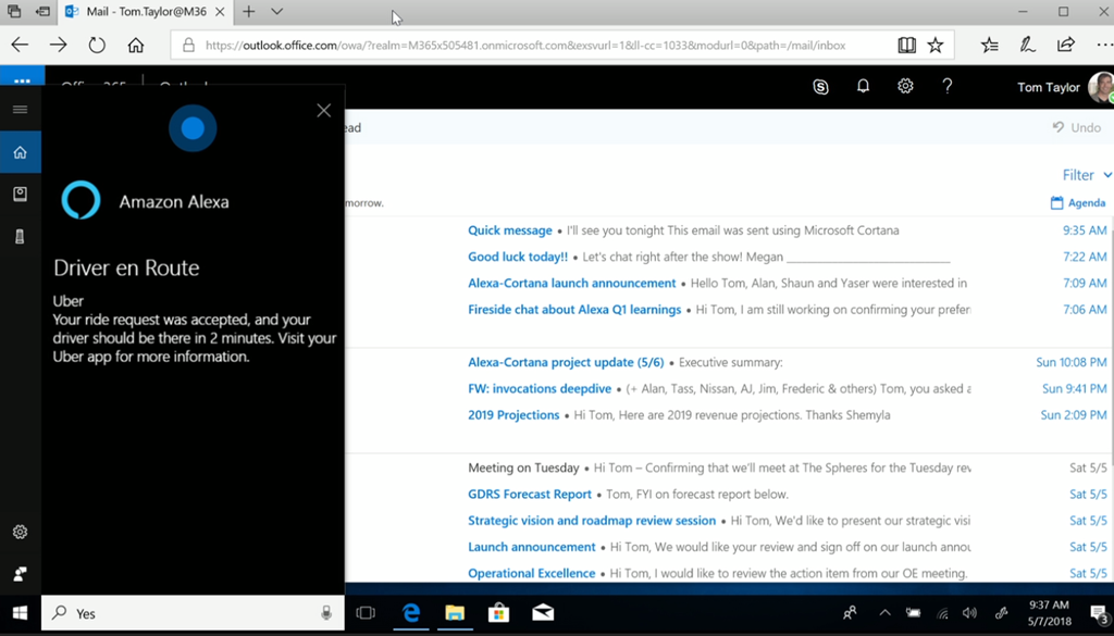 AlexaからCortanaを「Open Cortana」とか言って開きます。でCortana経由で自分の予定をしゃべらせたり。今度はPCから「Open Alexa」でAlexa開いてドライバー予約したり電気消したり。Cortanaどう思う?とか聞いちゃうのはご愛敬かな(