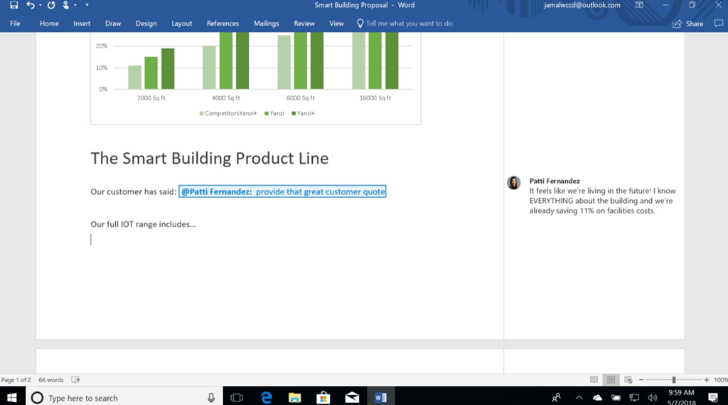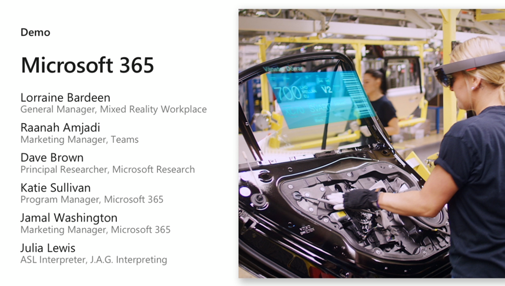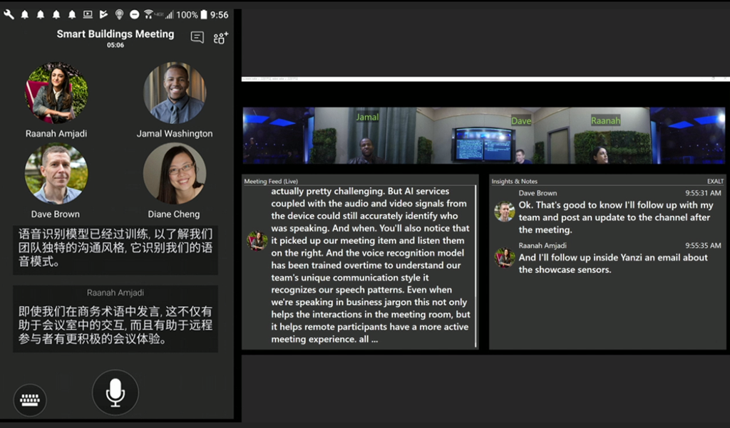 次のデモはRaanah氏から。Cortanaのスマートスピーカーですね。ミーティングのアテンドから人が会議室に入ったら挨拶したりリモート参加してる人含めて音声をテキストに起こしたり翻訳したり。Teamsと連携したりWord内でプレースホルダー設定してメンションするとその人の発言が自動挿入されたり。AndroidとPCを連携してシームレスに作業継続したりとか。(手話してる人気になったけどデモとは無関係かな?)![]()