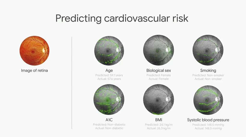 1つ目のトピックはGoogle AI。例としてヘルスケアですね。網膜画像からさまざまなリスクを機械学習させたモデルから判断。![]()