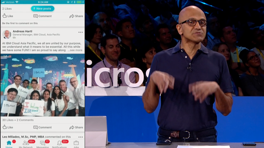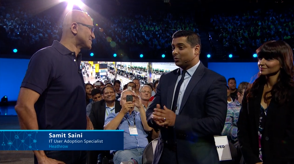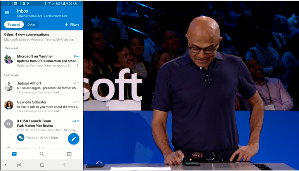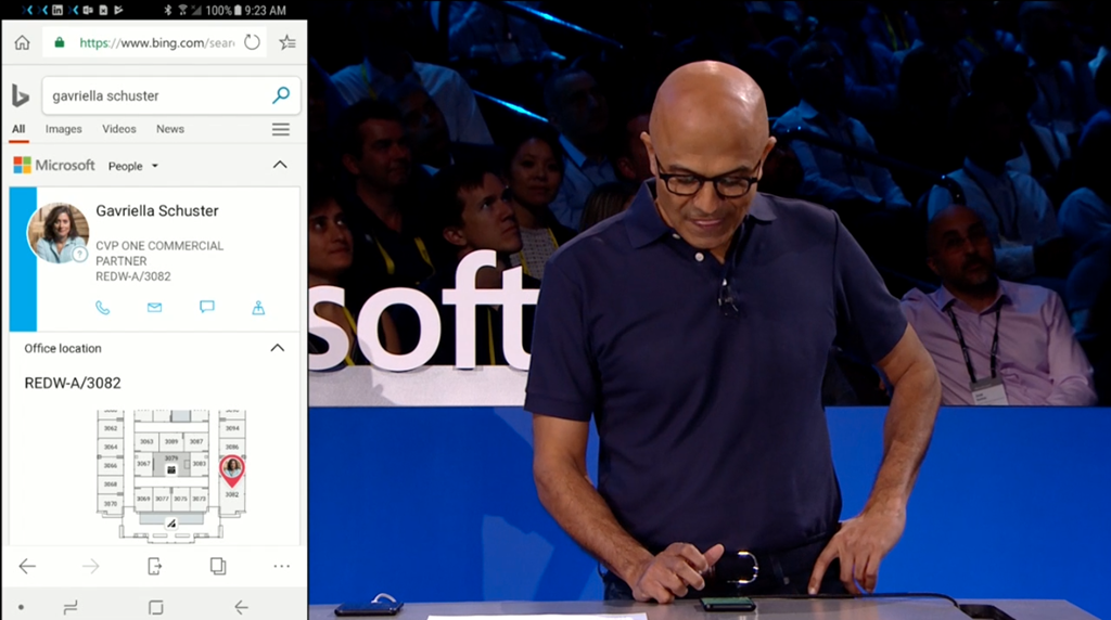 Xboxの動画。Xboxの他にSurfaceやSurface Studioなど。あとモバイル。モバイル版Office 365(OutlookやTeams、Yammer)を自ら紹介。Android版Cortanaも。Bingで組織内も検索とか。あとLinkedInやPower BI。Continue on PCでPCで継続作業(ブラウザのページ開いて)。Streamとか。あとMicrosoft 365の事例など。ヒースロー空港の事例とか。![]()