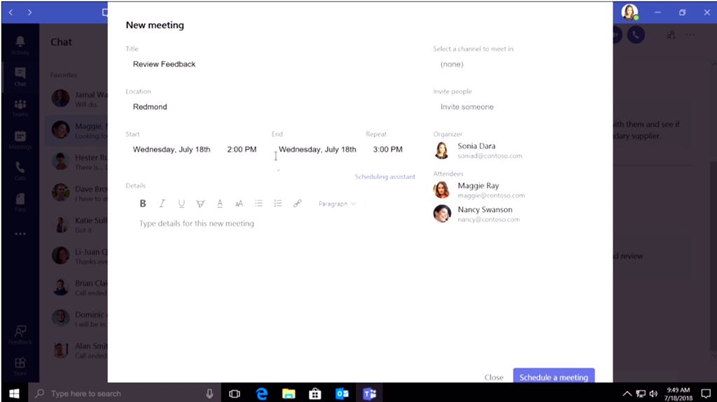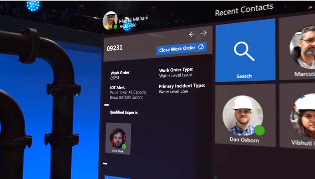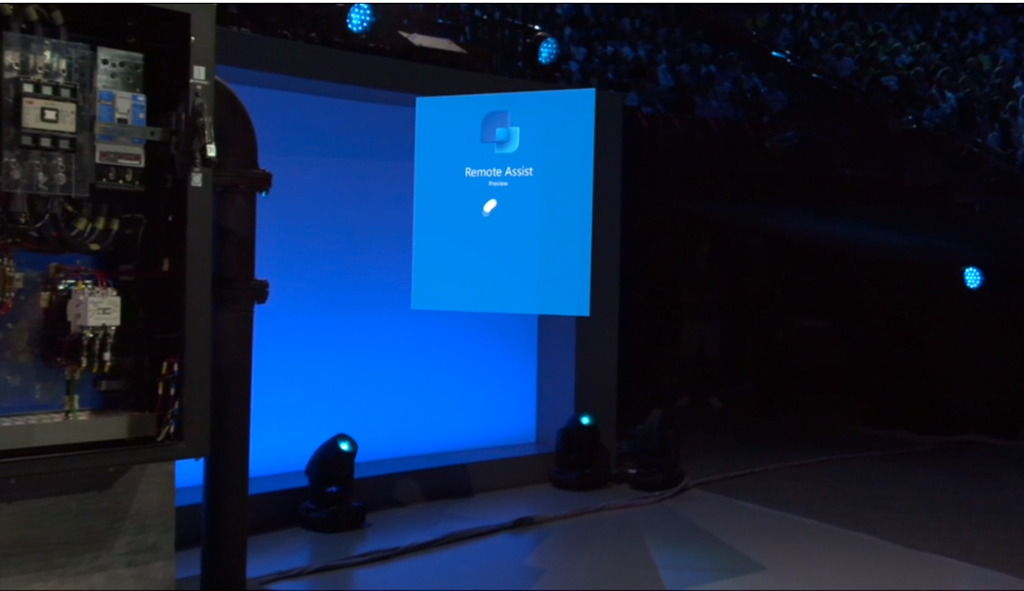 次はスマートオフィス的な。Buildでもありましたね。IoT的なやつで位置を把握して会議室までの案内とかスマートデバイス(プロトタイプ)使って入室したら人の把握やSurface Hubの制御ぽいことも。会話のテキスト化と翻訳も。リモートユーザーがホログラムぽくその場に参加してるような感じで。![]()