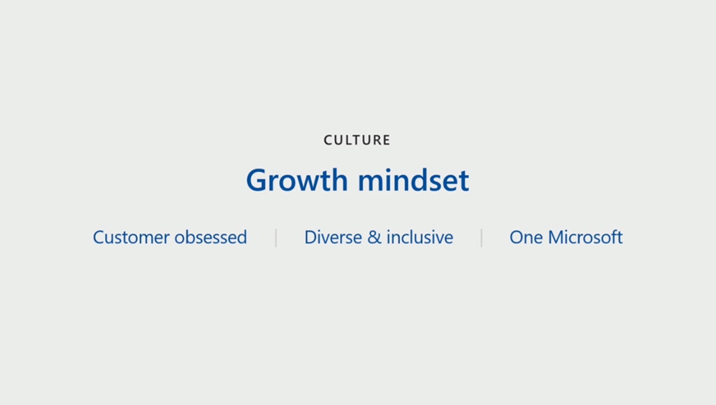 成長の考え方。顧客への執着、多様・包括、One Microsoft。母親や家族へのサポート。サポートを必要としてる彼らが最適に仕事をできるようにエコシステムで、Microsoftですることが使命、かな。(最高の機会みたいな)![]()