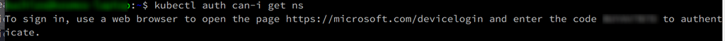 次にkubectlなどで実際にk8sのマスターノード(API Server)にアクセスする際ですが、k8sのRBACが有効だとこの時点で認証が必要となります。というのもaz aks get-credentialsで取得した中身はマスターノードの情報など最低限のものなので、ユーザーに関する情報は含まれていないのでk8s側は認証されてないものとして扱います。認証プロバイダーがAzureに設定されてるようなので、kubectlはデバイスログインに必要なURLとコードを返してくれます。![]()