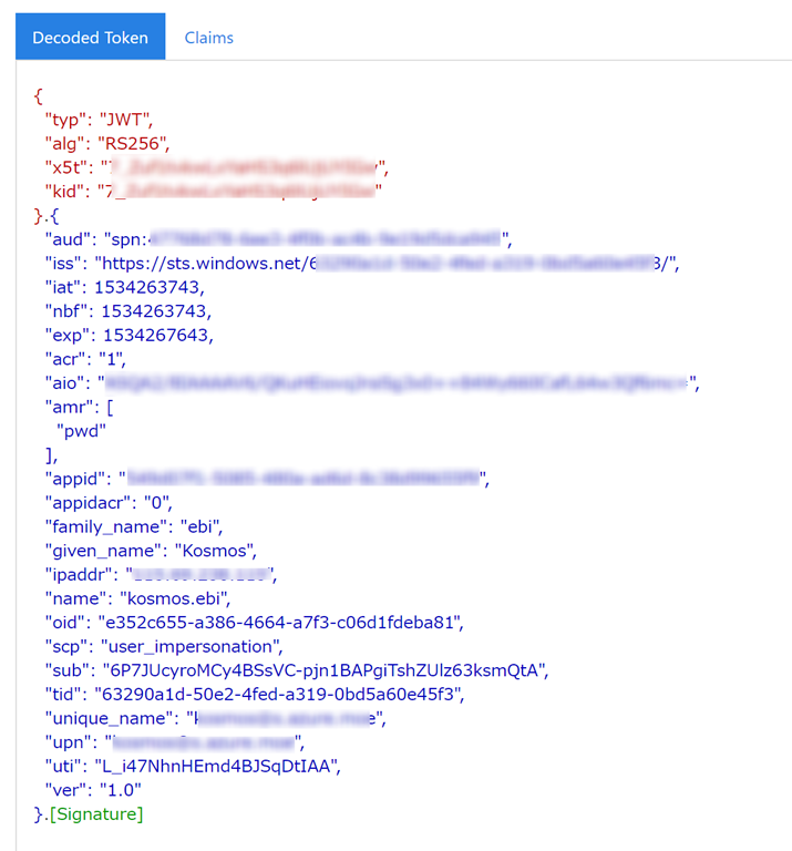 この access-token はJWTなトークンなので、そのままBearerトークンとして使えますしデコードするとちゃんと中身が見れます。![]()