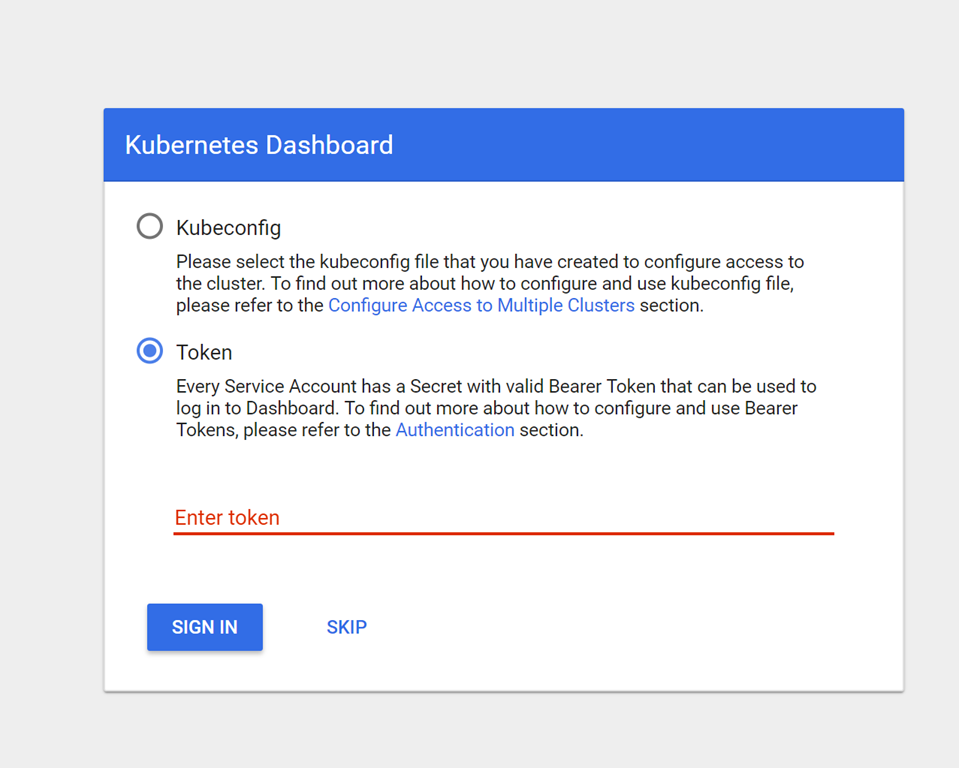 とりあえずサービスアカウント権限で何でも誰でも見れてもいいので回避したい場合はClusterRoleBindingを使ってkube-system:kubernetes-dashboardサービスアカウントにcluster-adminを割り当てます。