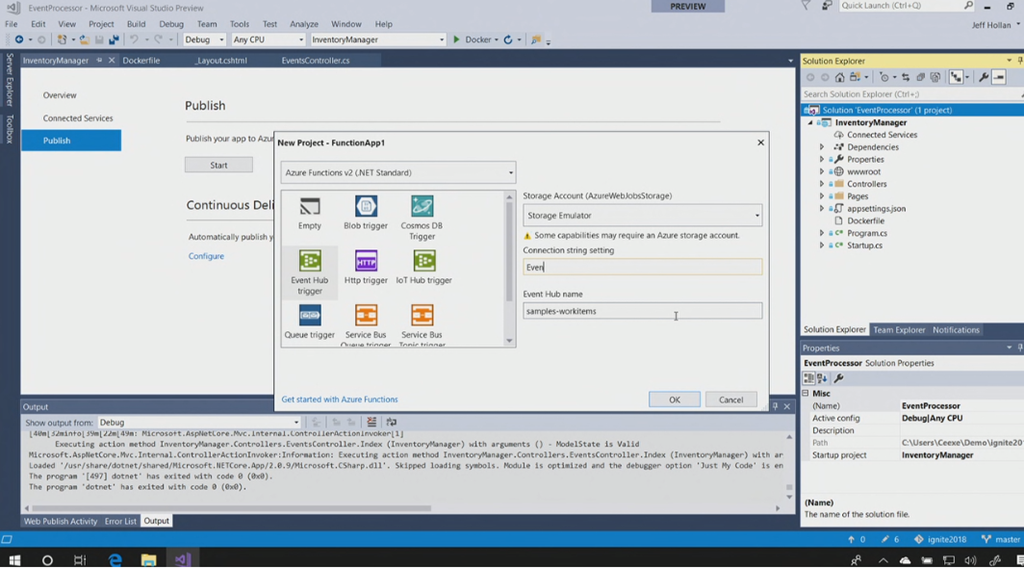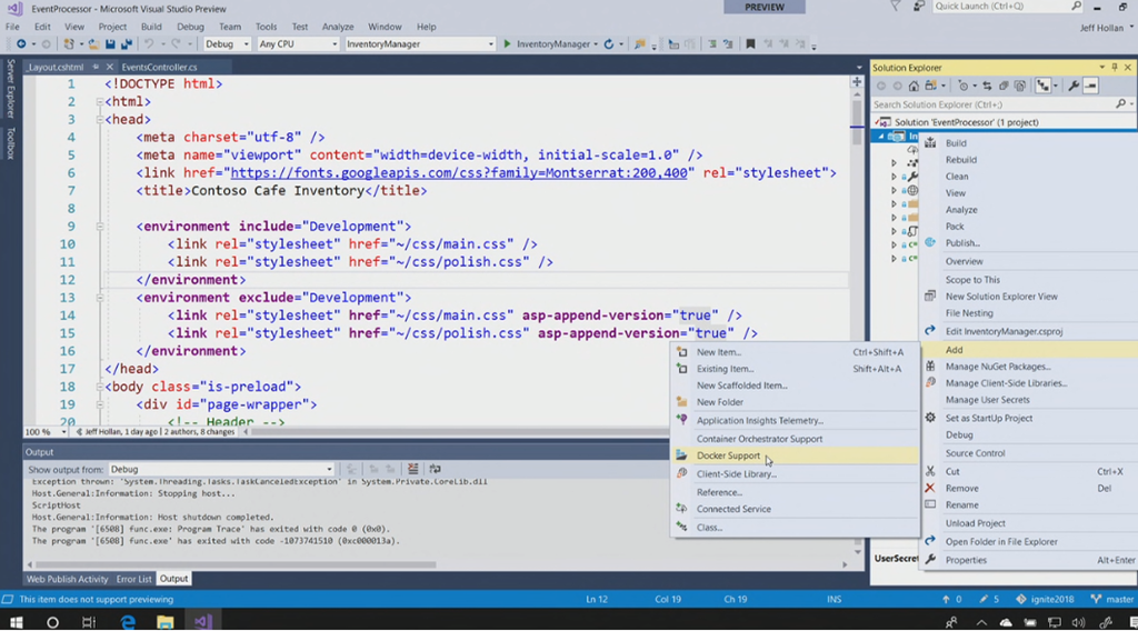お次の話題はServerless。Jeff氏からモダナイズのデモ。普通のWebアプリをVisual StudioからDockerコンテナー関連を追加してコンテナーへ。コンテナーになってもデバッグはもちろんOK。そのままAzure Web AppsへデプロイもOK。![]()
