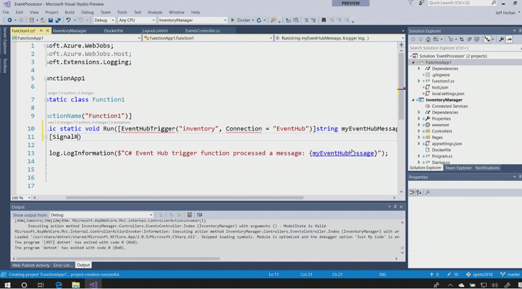 次は今日2.0がGAしたFunctions。同じくGAしたSignalR Service使ったりするようです。Bindingちゃんとあるんですね。Event Hubで受け取ったデータをSignalRに流すことでリアルタイムにデータが更新されるというデモでした。![]()