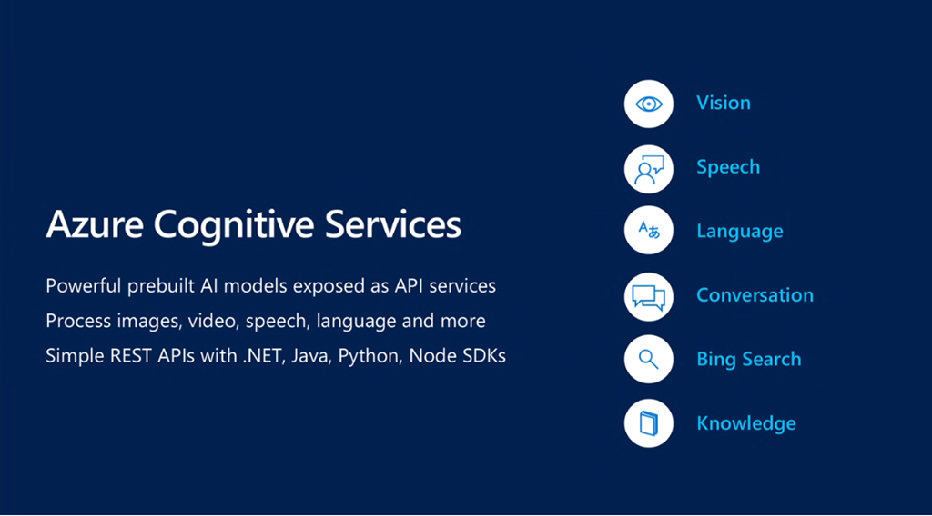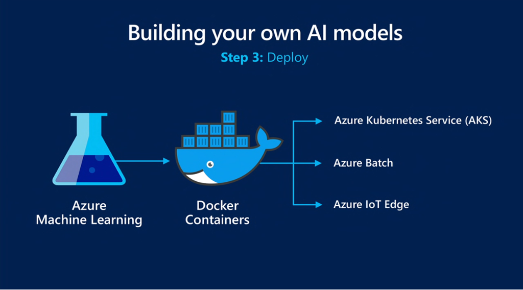 AI関連ということでCognitive Services。いろいろありますけど自分のAIモデルを構築するのも要望として多いですよね。最初のデータを準備するところではAzure Databricksなどを。ビルドしたり学習するステップではAzure Machine Learning。TensorFlowやKeras、PyTorchなどもサポートしてます。次はデプロイ。出来上がったモデルを使うサービスをDockerコンテナーにしていろんなサービス上で実行できます。![]()