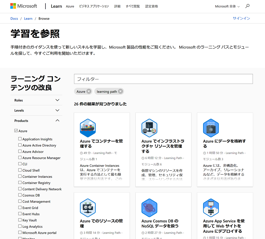 今現在は1単元的な感じで小さいトピックでまとまったモジュールと、認定資格取得やロールにそったラーニングパス(いくつかのモジュールがまとまったもの)などが公開されています。![]()