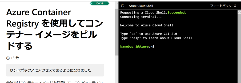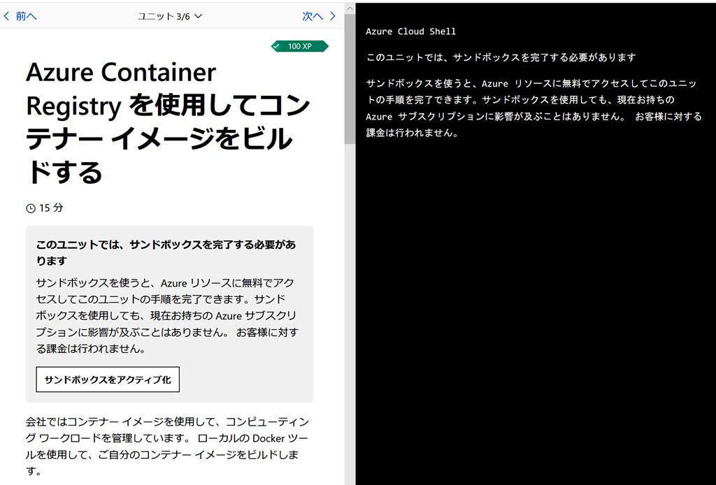 例えばAzure Container Registryを学ぶモジュールだと最初にサンドボックスをアクティブにします。![]()