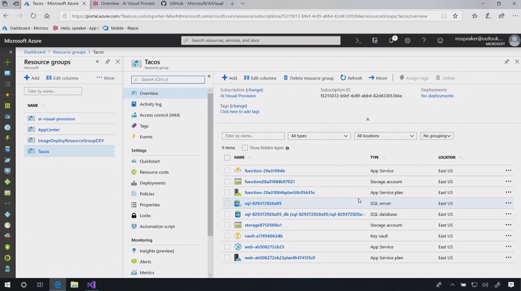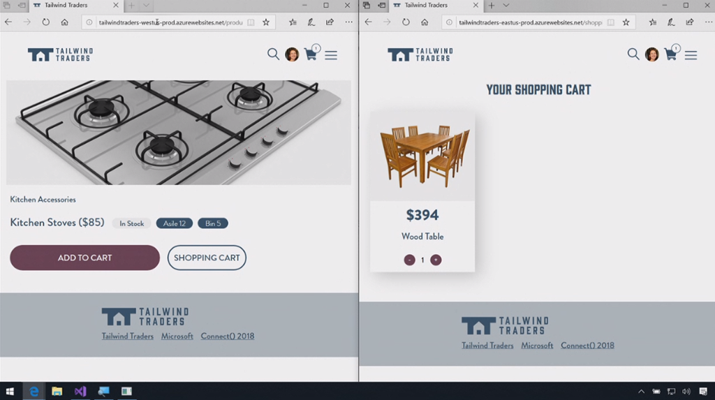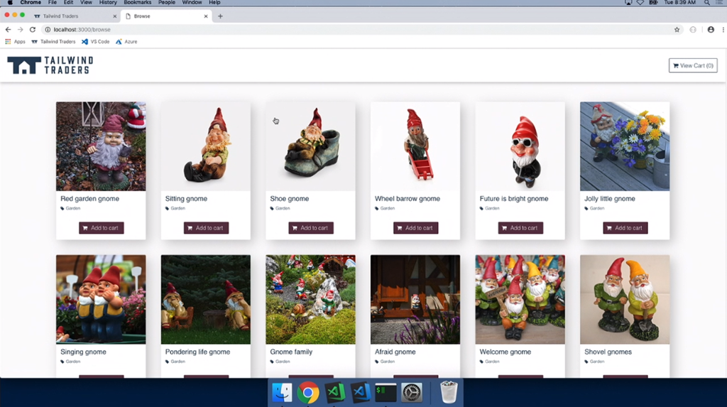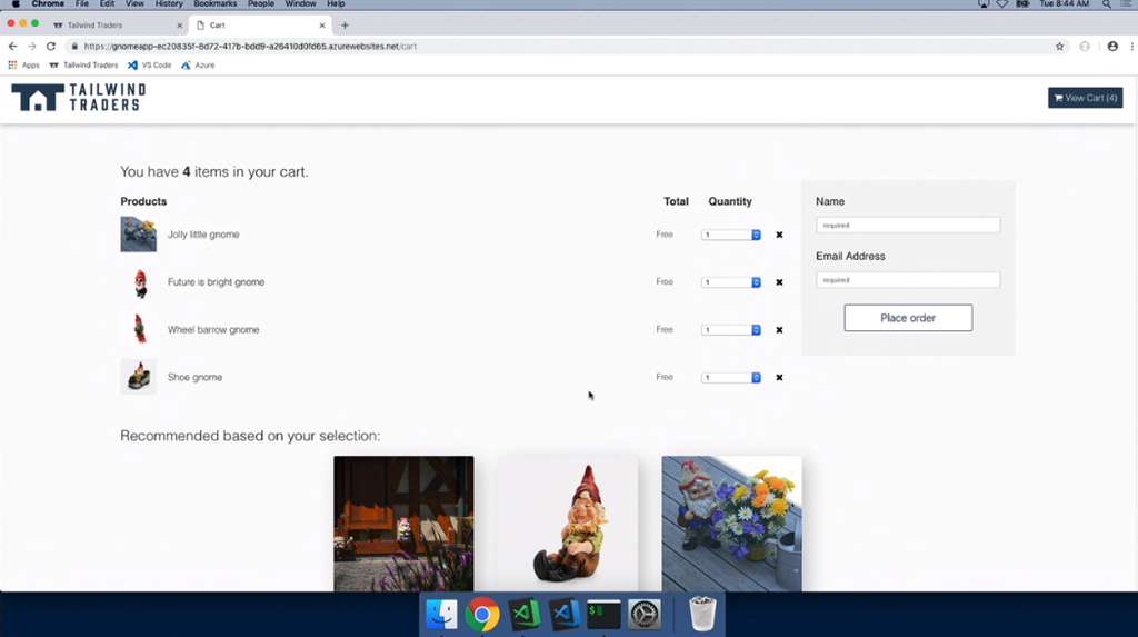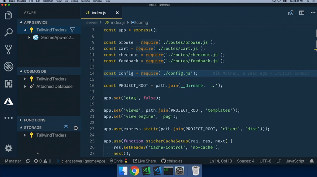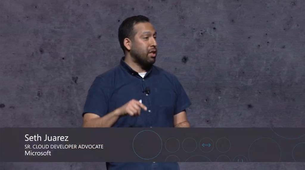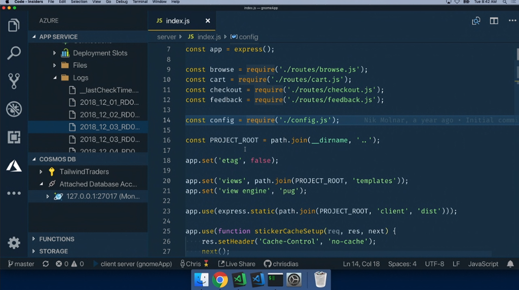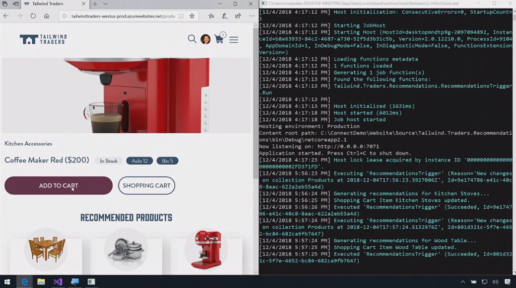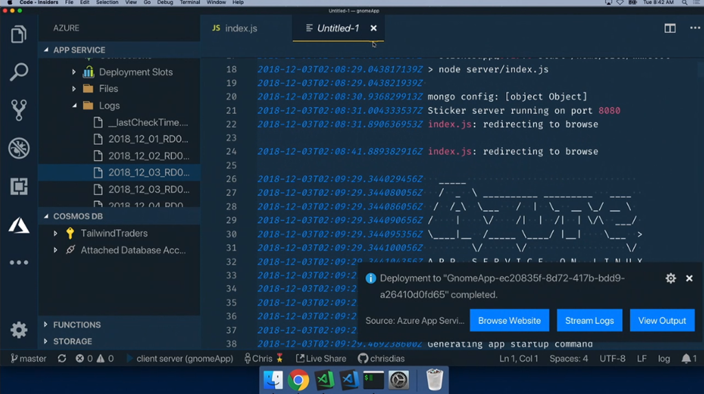最初のデモはChris氏。macOS上でのVisual Studio Codeかな。node.jsなアプリの開発。IntelliCode拡張でインテリセンスが効くしサジェスト内容はAI使って適切と思われるのを提案してくれる。デバッグもできるよ。Gnomesのフィギュアの販売サイトかな?開発終わったらAzure拡張つかうと直接Azure Web AppsにデプロイもOK。DBにはCosmos DB使ってる。Functions経由でレコメンドも実装済み。![]()