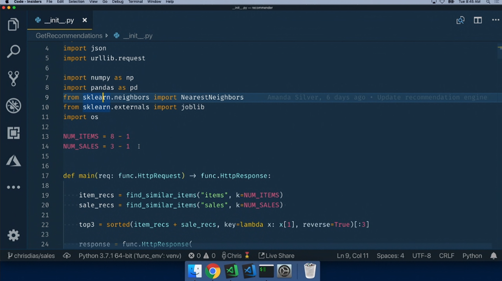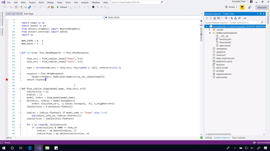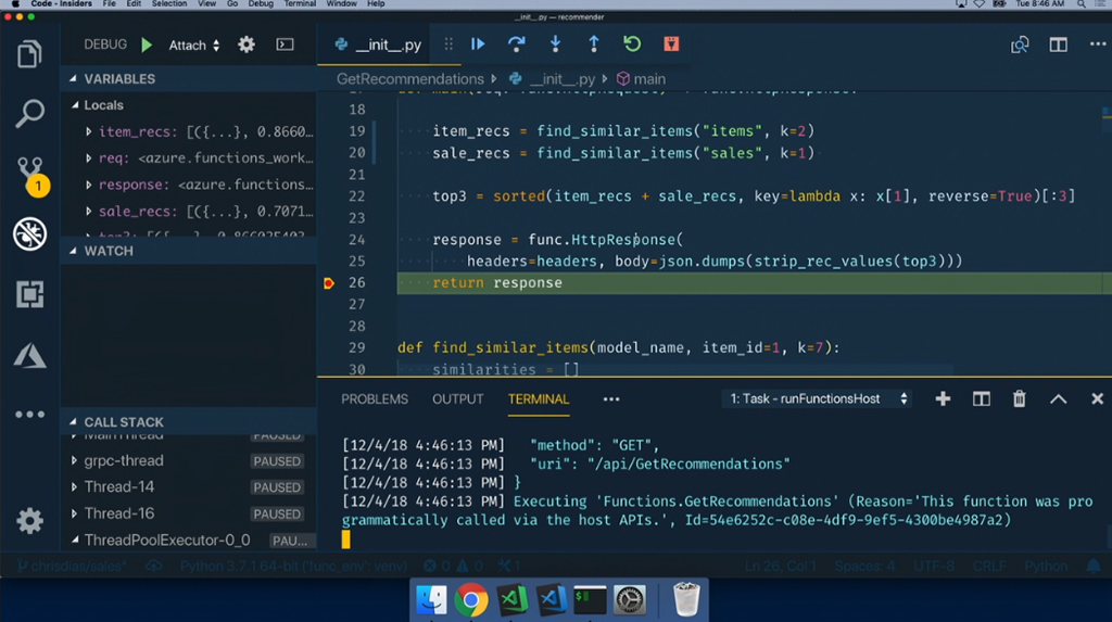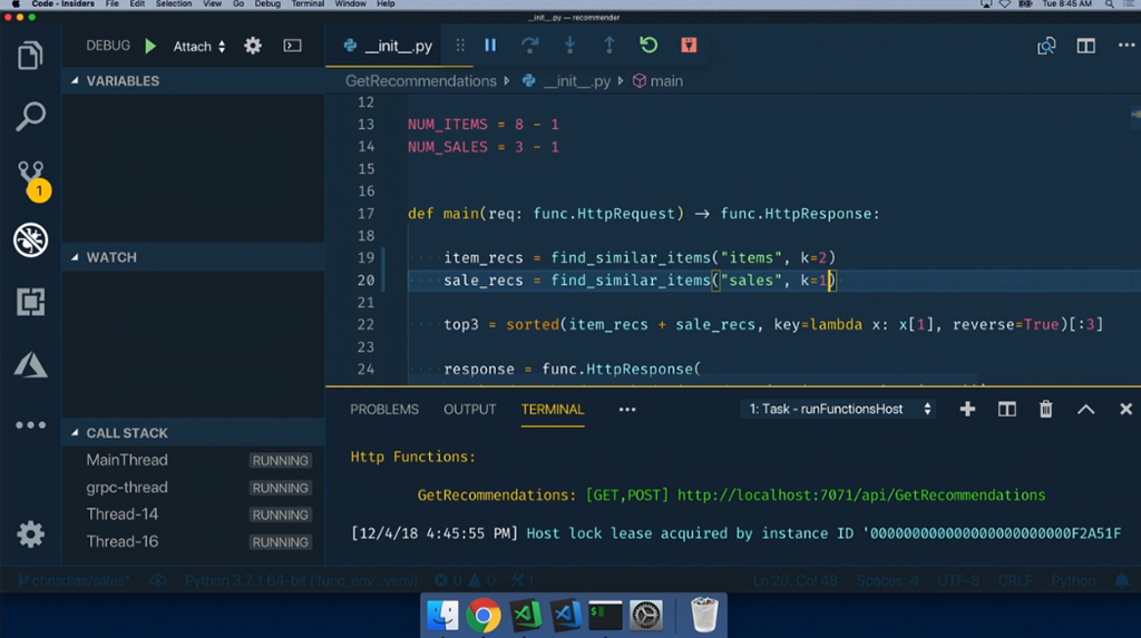 レコメンド部分はPythonでFunctionsで動作するコードを書いてる。もちろんVisual Studio Codeで。そのまま実行やデバッグもOK。![]()