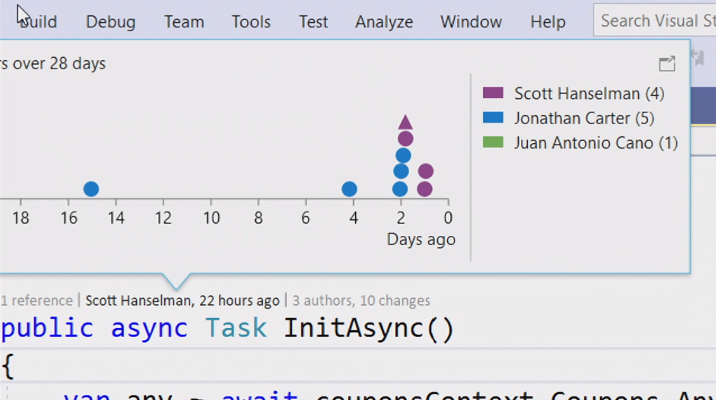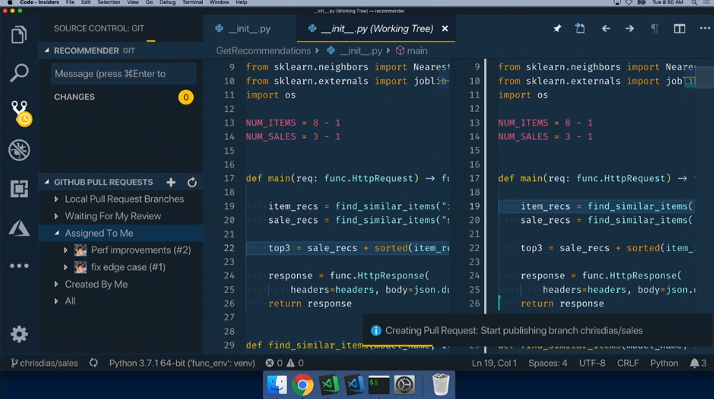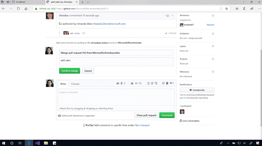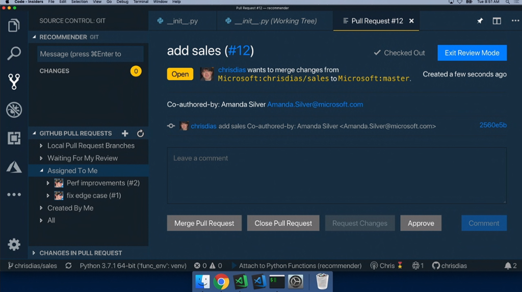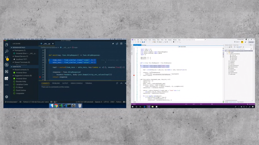 Live Share機能で他の人と共同作業。Amanda氏はVisual Studioですね。GitLensを使って差分をみつつPull Requestを作ってGitHubと連携。![]()