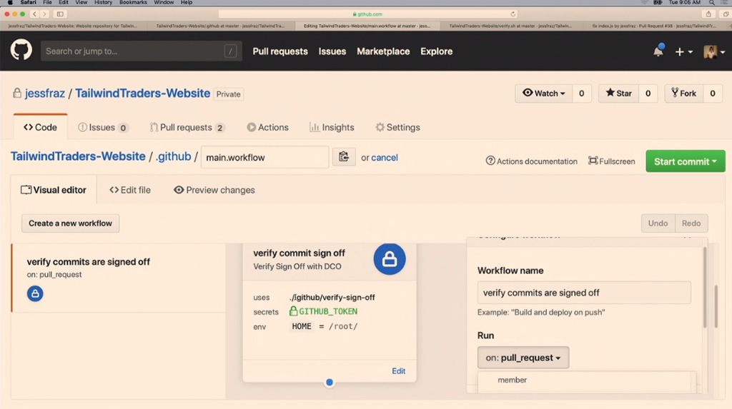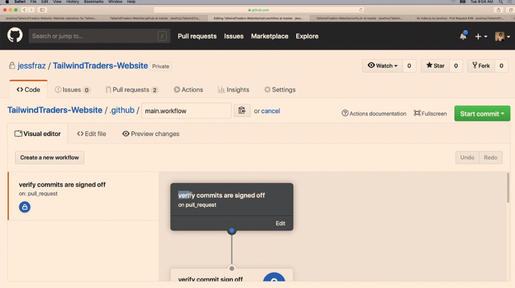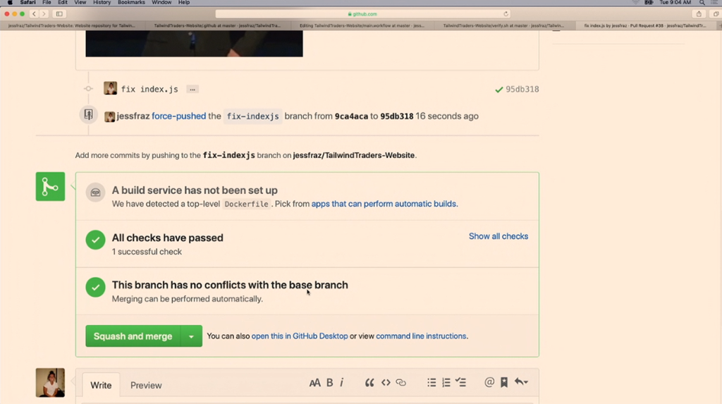 デモはJessie氏。PR作るとActionsで設定したワークフローが走ります。デモではFail。コミットメッセージを入れろかな。修正して再度あげると今度は成功。フローも簡単に作れますしスクリプトで記述もできます。![]()