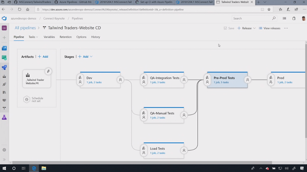 Azure Pipelineとの連携も。Azure PipelineはPythonなどのOSSもサポート。という流れでAzure DevOpsのデモはDonovan氏。パイプラインをYamlでかけたりもします。リアルタイム(オンデマンド?)でもビルドできるしGitHubと連携もOK。リリースパイプラインもフロー組めるし細かな処理も構成できます。リリースパイプラインの中で最終的に人が承認したらリリース、というのも組めます。という感じでAzure DevOpsにはPipelineなどなどが含まれます。![]()