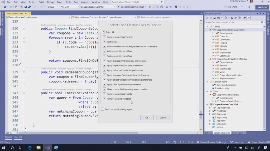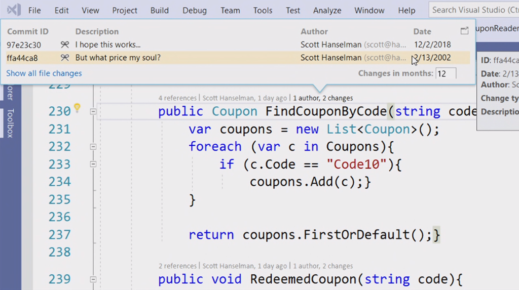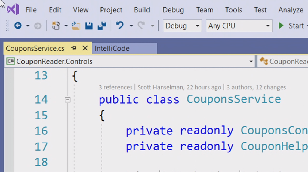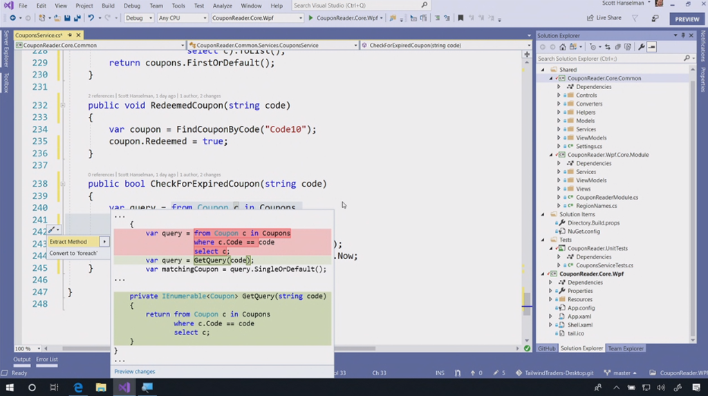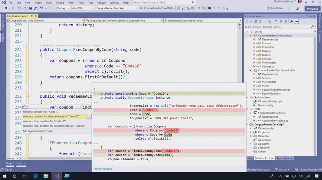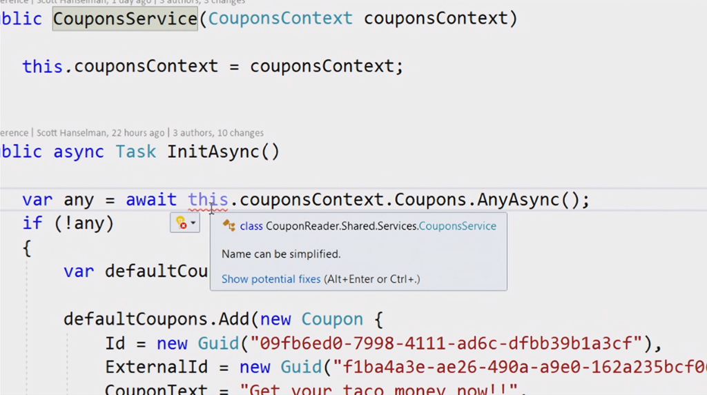 次のデモはVisual Studio 2019関連。Scott Hanselman氏から。スタートスクリーンもだいぶ変わりました。デモのコードをCodeLensでみると最初が16年前だ。。という古いコードをぽちぽちとリファクタリング。サジェストからささっと直していきます。IntelliCode(★ついてるやつ)がAIからサジェストされた内容。懐かしいバーコードリーダー(を使うと思いきや手打ち)でクーポンを表示するデスクトップアプリがちゃんと動きました。![]()