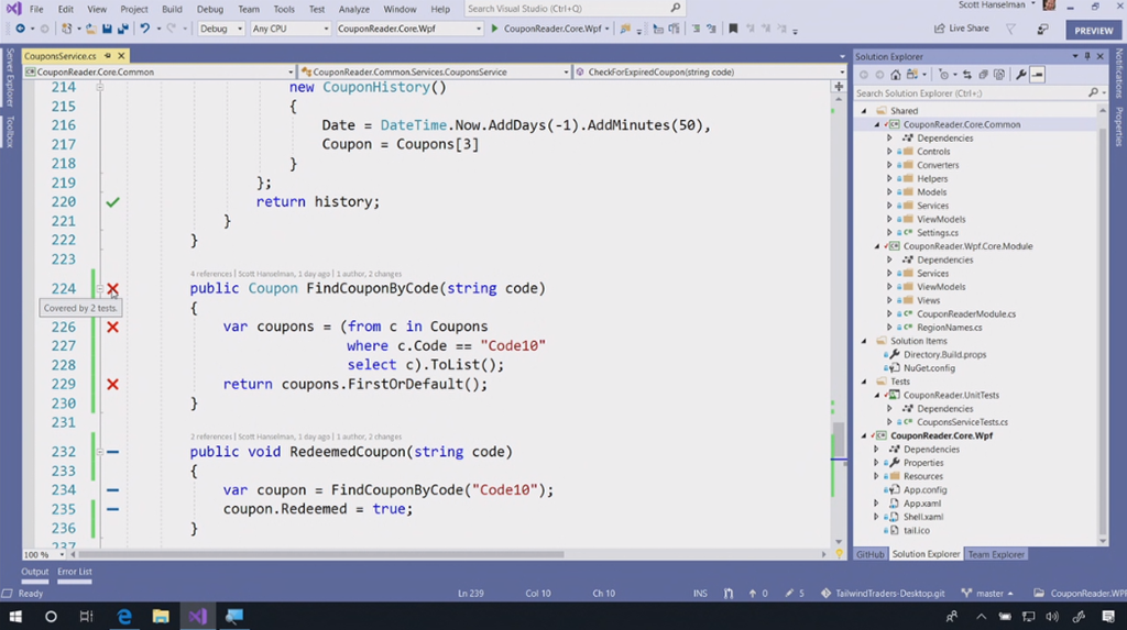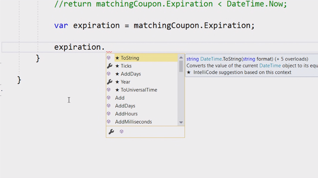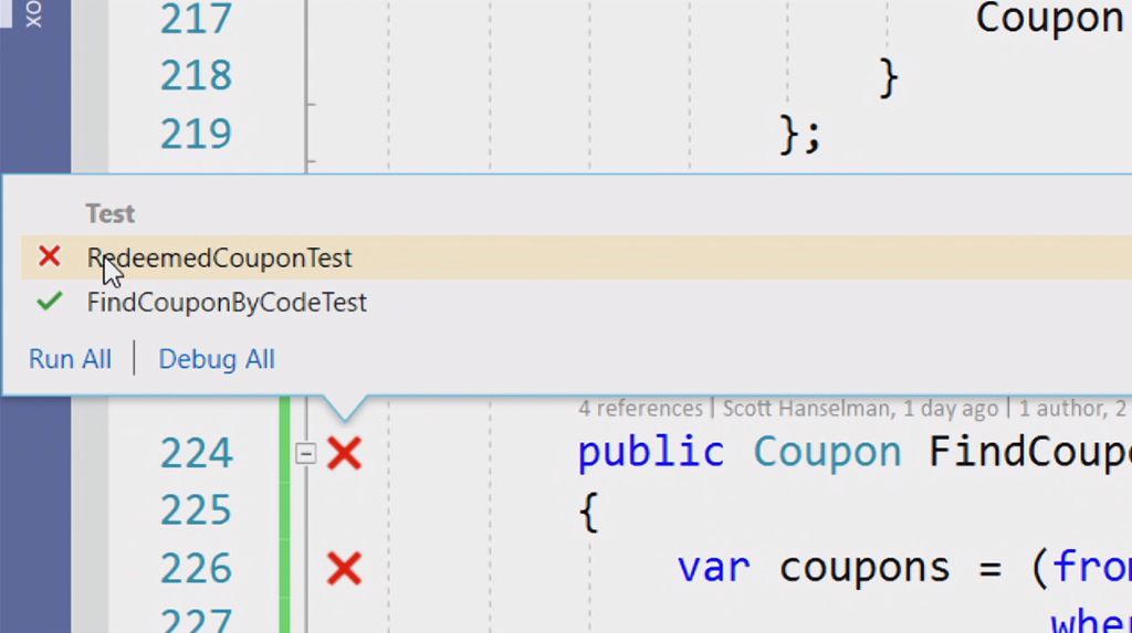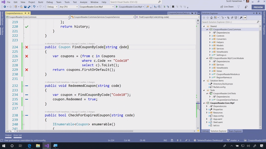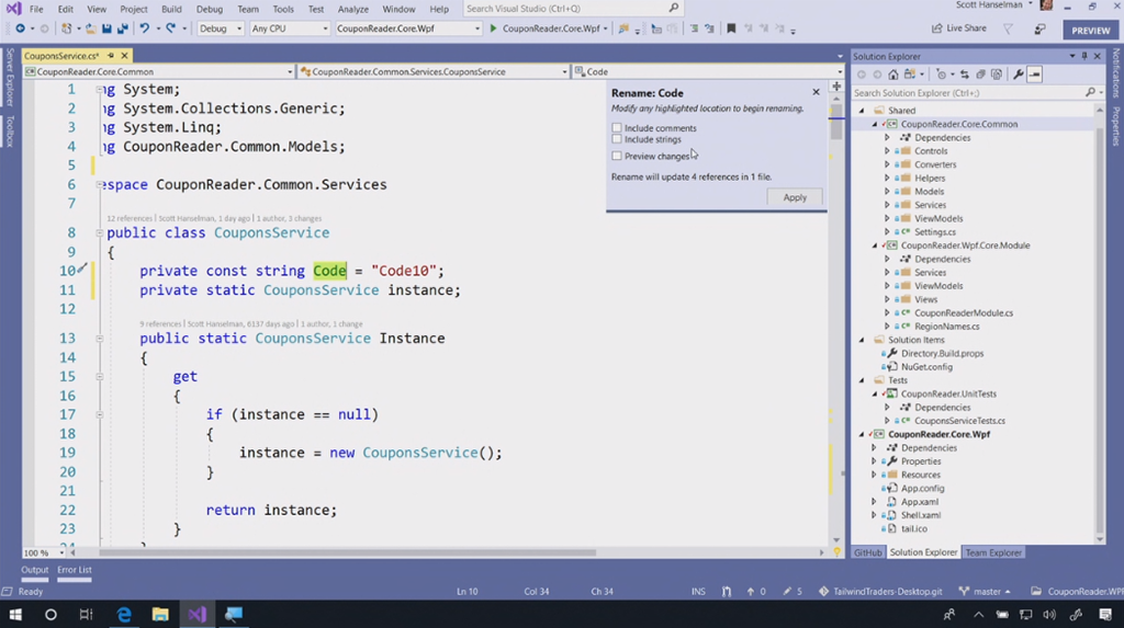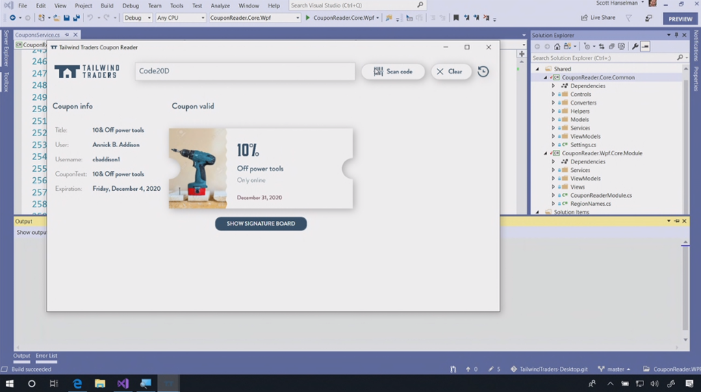 次のデモはVisual Studio 2019関連。Scott Hanselman氏から。スタートスクリーンもだいぶ変わりました。デモのコードをCodeLensでみると最初が16年前だ。。という古いコードをぽちぽちとリファクタリング。サジェストからささっと直していきます。IntelliCode(★ついてるやつ)がAIからサジェストされた内容。懐かしいバーコードリーダー(を使うと思いきや手打ち)でクーポンを表示するデスクトップアプリがちゃんと動きました。![]()
