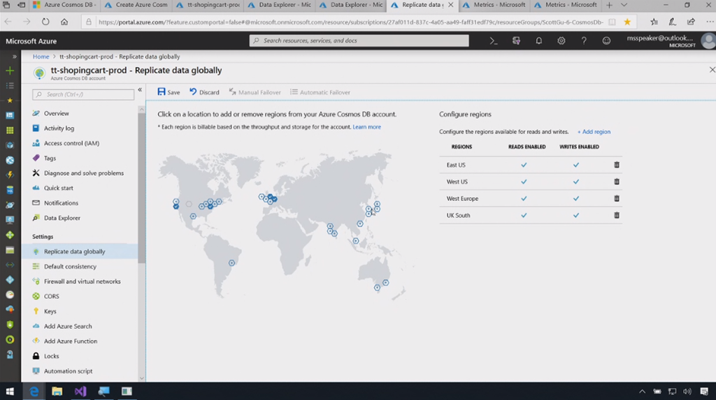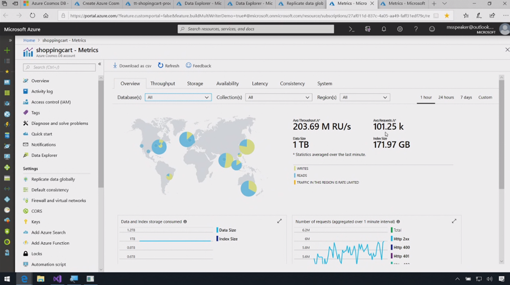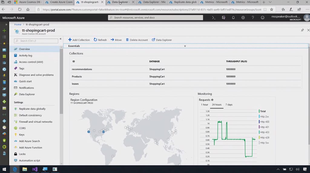 デモはRimma氏。Cosmos DBは複数APIあるので任意に選択。ぽちぽちと別リージョンにレプリカを作ったり。2つのリージョンにそれぞれした接続して片方でカートに追加するとすぐに別リージョンにも複製されてカートの中身が反映されます。Change Feed取れるので更新をすぐに取れたりもします。デモではFunctionsで受け取ってましたね。10万リクエスト/sさばいてるのが見れたり。![]()